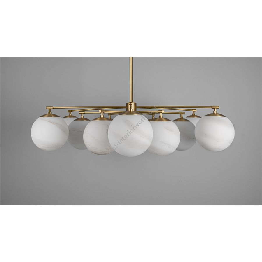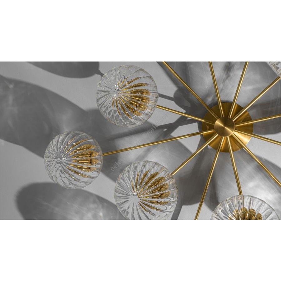 The crystalline clarity of the translucent sphere gifts a spontaneous, ethereal quality, aided by unassuming brass ceiling fixtures.