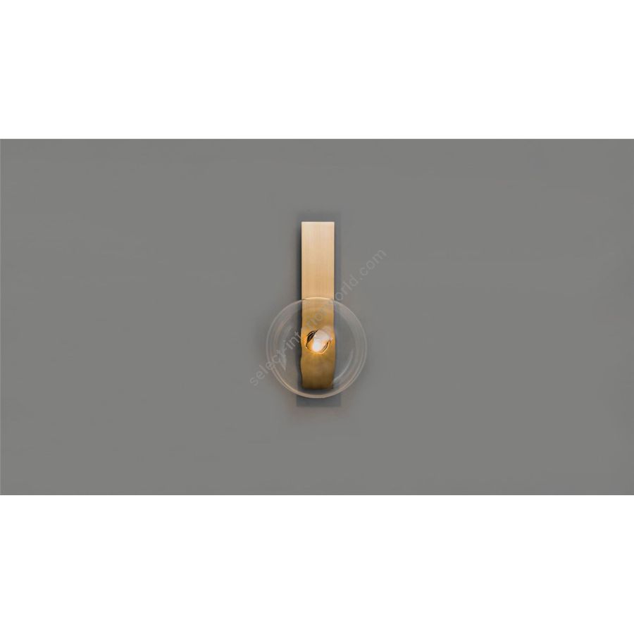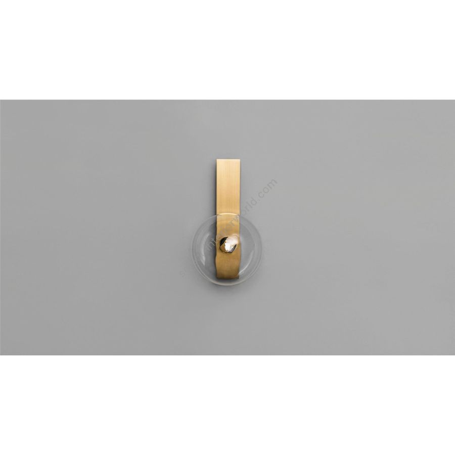A single glass bubble alights upon a slender rectangle of brass for an essential design. Inspired by the sober compositions of mid-20th century Norwegian artist Ragnhild Keyser, the unique surface curvature of the mouth-blown globe lends a subtle optical distortion to minimalist lines.