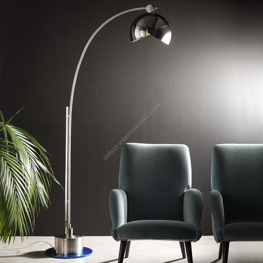 Floor lamp in polished and satin nickel-plated brass, the accent in the base is in light blue metallic glaze.