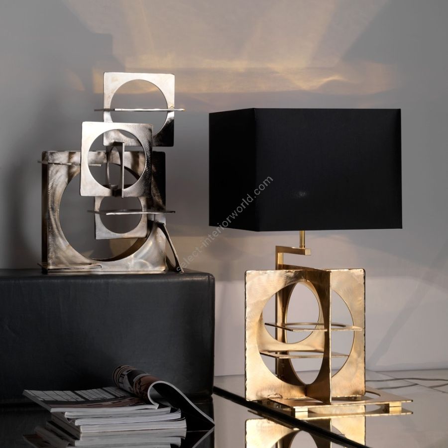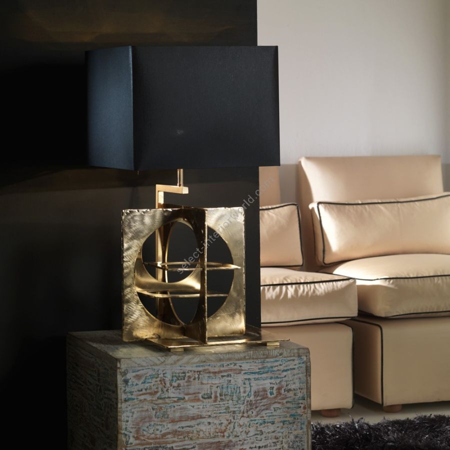 This table lamp was made with frosted iron sheets, engraved by hand and then carefully welded by hand to create a geometric sculpture. The finish is in coated gold giving it an aged effect. The peculiarity of this table lamp is its sculpture. The lampshade is in refined black Chintz with a gold foil inside. Suitable for both contemporary and classic environments, it presents in combination an object. The structure can also be made of coated nickel. In addition to living areas and studios, it can adorn rooms and fattening.