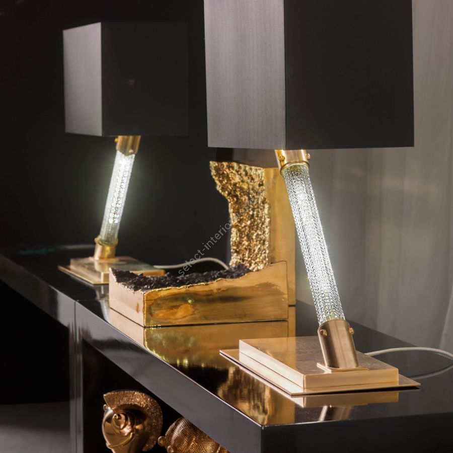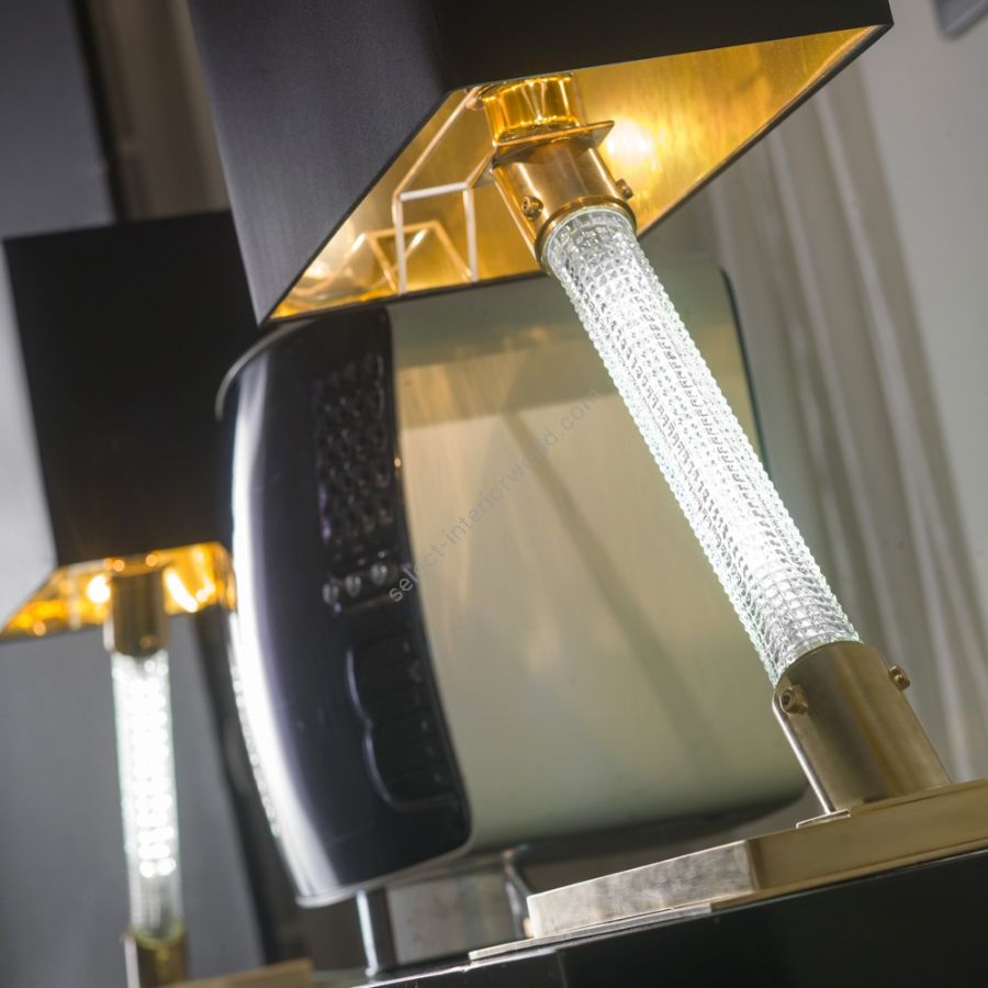 Lamp with golden brushed brass base and details. Hand cut crystal cylinder with inner lighting and shade lighting. Black chintz lampshade with golden inside.