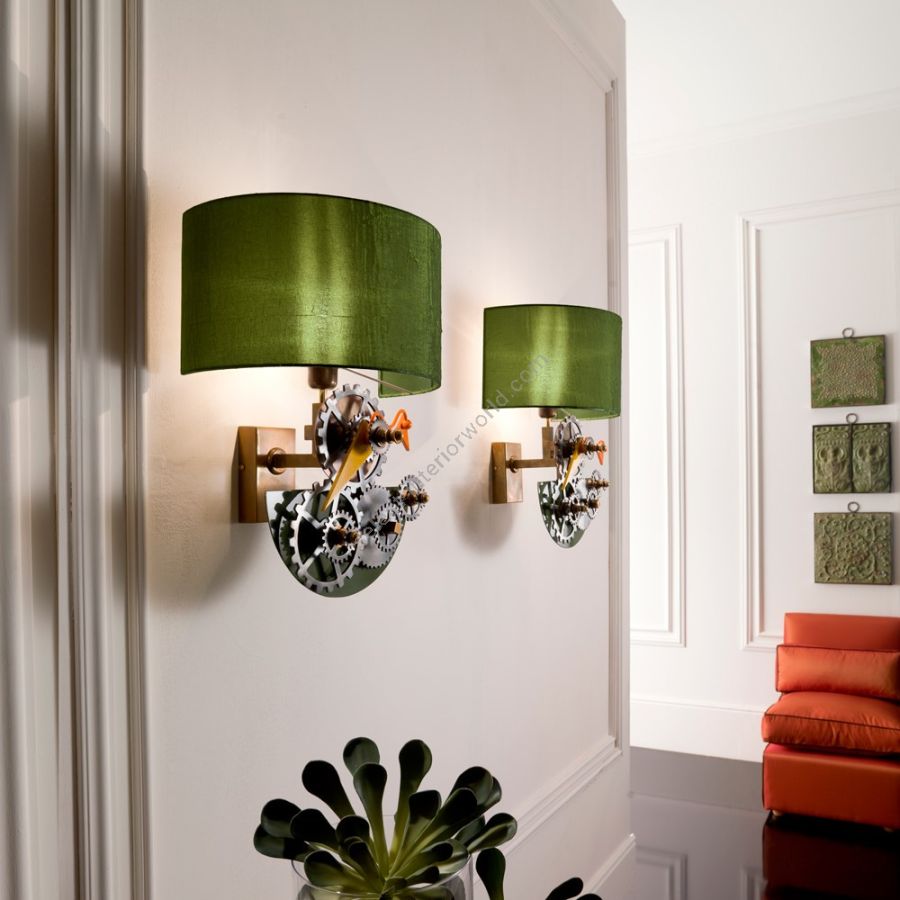 Burnished brass and iron wall lamp with pewter gearwheels. Orange and yellow minute hands, burnished brass and green details. Green “lux” silk over green silk double lampshade.