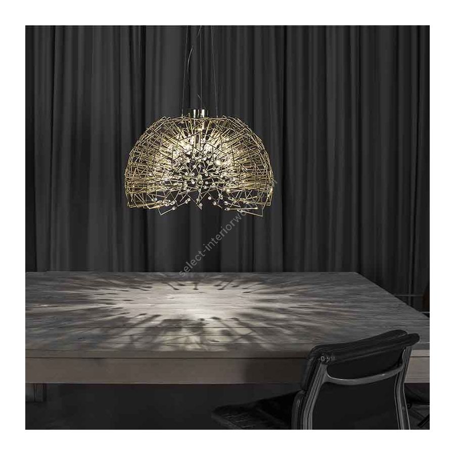 Core is reminiscent of the natural energy at the heart of our world. Like bright lava seeping through the earth’s crust, vibrant spheres of faceted crystal break through the iron surface of this pendant. Forcing light to pass through this metal structure results in a powerful, vibrant exchange of forces light and shadow erupt across the room, as the LED light pours through, as the light itself emits an organic radiance.