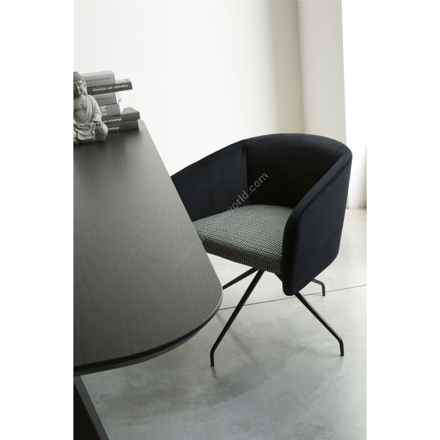 The Balù collection is extended by adding the OFFICE version, with a swivel base with 4 metal spokes suitable for multifunctional environments, is proposed with a foam shell and with a tapered swivel base in chrome, white or black. The collection includes numerous chromatic variations and shades with the possibility of playing with different combinations. The deep and rounded seat of Balù invites relaxation and conversation. Armrests and backrest develop into a single band, enveloping like an embrace. The soft and compact padding enhances the formal cleanliness of the chair and promotes comfort. Warm and natural tactility for the upholstery, in velvet, leather or eco-leather or in one of the many fabrics with many color variations proposed by TrabÀ. The simple supports are slightly inclined and with a very dry line. Balù lives with simplicity in every room of the house, from the living room, to the study or sleeping area. Several Balù armchairs, also in different finishes and coverings, can be freely combined with each other, in different domestic situations as in contract spaces.