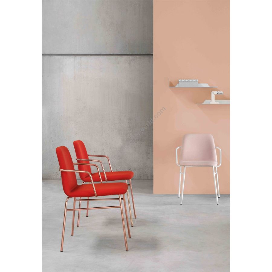 | Description: | Structure with tubular leg and armrests in painted metal or in polished chrome, polished black chrome, polished brass, upholstered shell. |