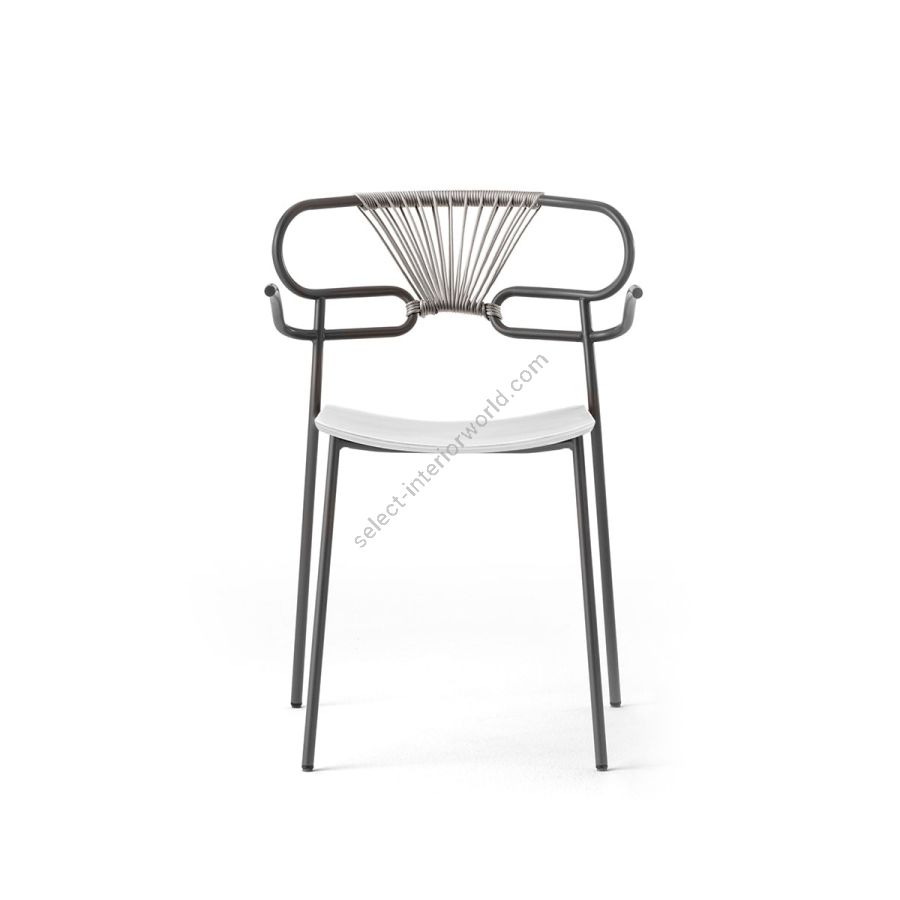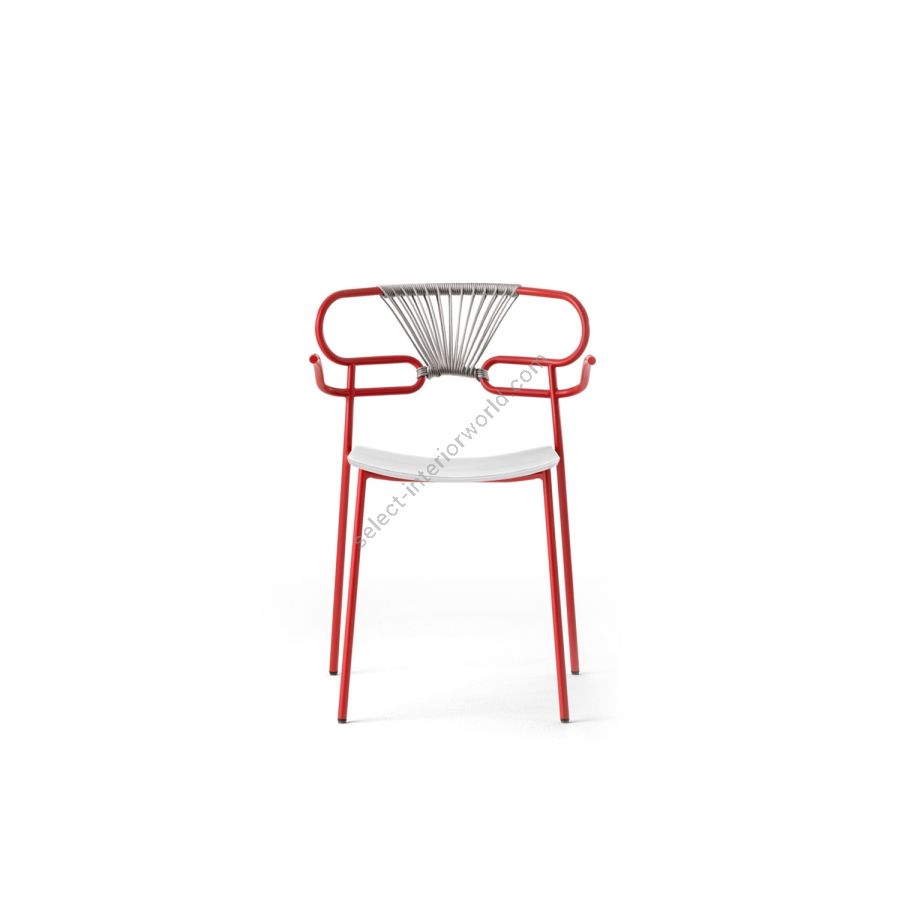 | Description: | Stackable structure with armrests in painted metal or in polished chrome, bright black chrome, polished brass, seat in ash, back with colored rope weaving. |
