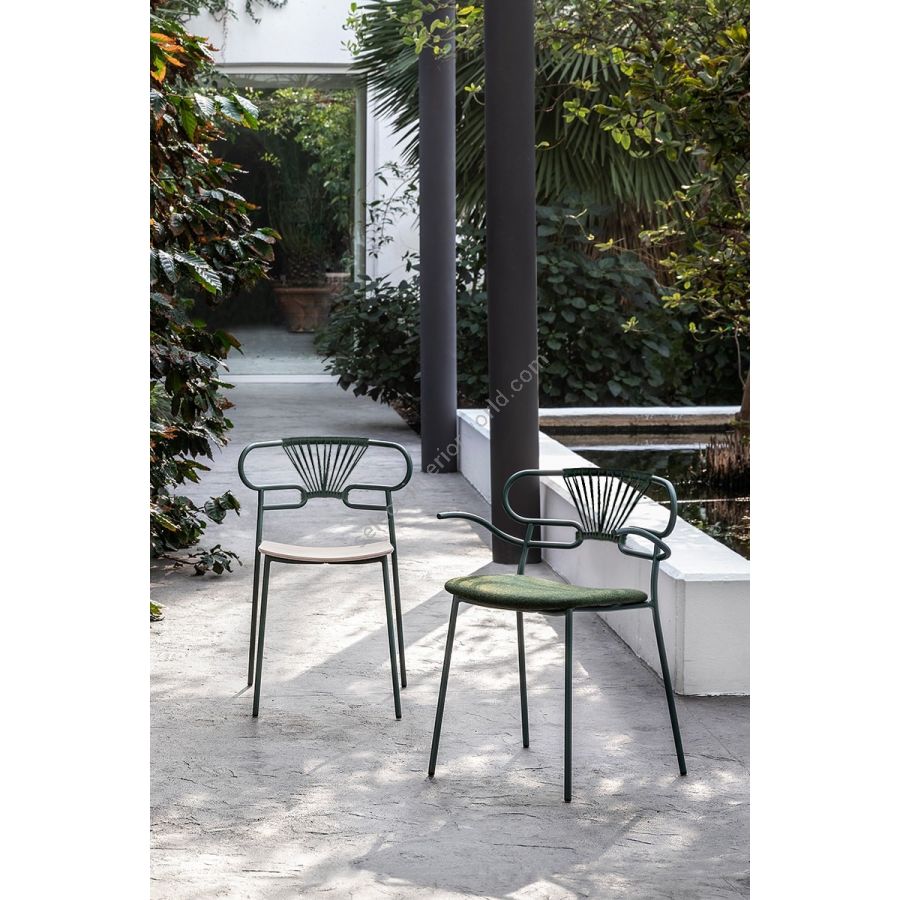 The Genoa chair collection, by talented young designer Cesare Ehr, featuring a stool and a chair with armrests, is also available in an outdoor version. The distinguishing element is the ‘one-line’ backrest, obtained by curving a single metal tube which - with its virtually endless wavy line, also extended to the armrests in this new version - is an elegant addition to every space, bringing a sense of lightness.The outdoor version of the chair will be presented at Salone del Mobile 2019. With integral body in polyurethane, mass painted in the mould, it is also available with a woven backrest in coloured rope to enhance both its look and the level of comfort provided.The frame in powder-coated tubular metal comes in a wide variety of colours; the slightly curved seat - for the indoor versions - is in ash wood (left au naturel or painted) or upholstered with various fabrics, leather or eco-leather.