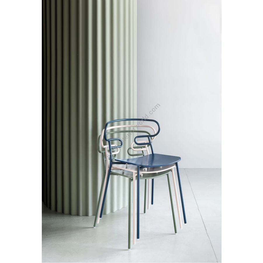 | Description: | Stackable structure in painted and lacquered metal in different colors, wooden seat. |