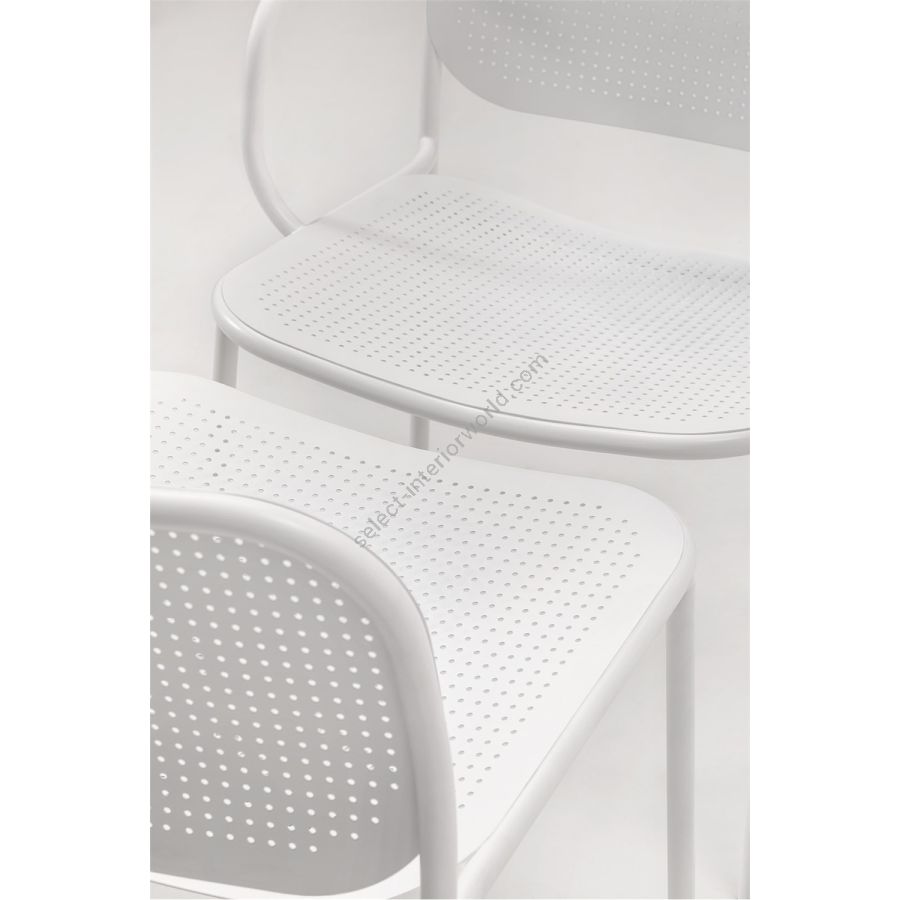 The METIS DOT collection includes the chair with or without armrests, the lounge version with or without armrest and the stool in two heights. In all versions, the tubular metal frame is complemented by curved metal sheet backrests and seats with a decorative hole pattern, as a modern interpretation of the classic Viennese weave. Available in all standard and special colors, METIS DOT brings its unique style to indoor and outdoor spaces.