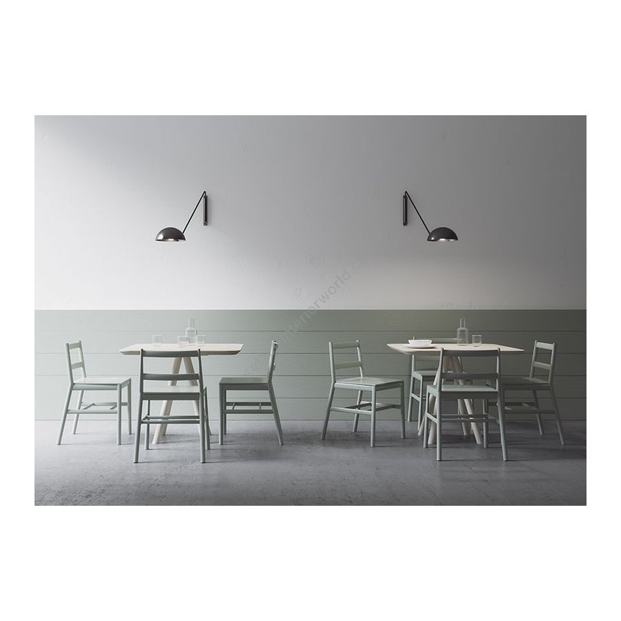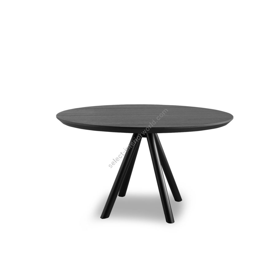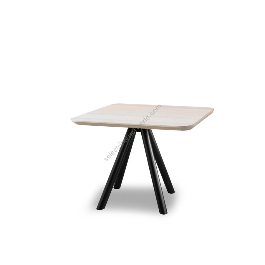 Two new solutions for the AKY table collection, which is enhanced by a tête à tête variant: you can choose between a square or round top, for intimate breakfasts in public environments or to personalise small living spaces. AKY is supported by legs with central meeting point available in wood, combining solid and fluid shapes, or metal, to provide the table with both ascending tension and lightness.