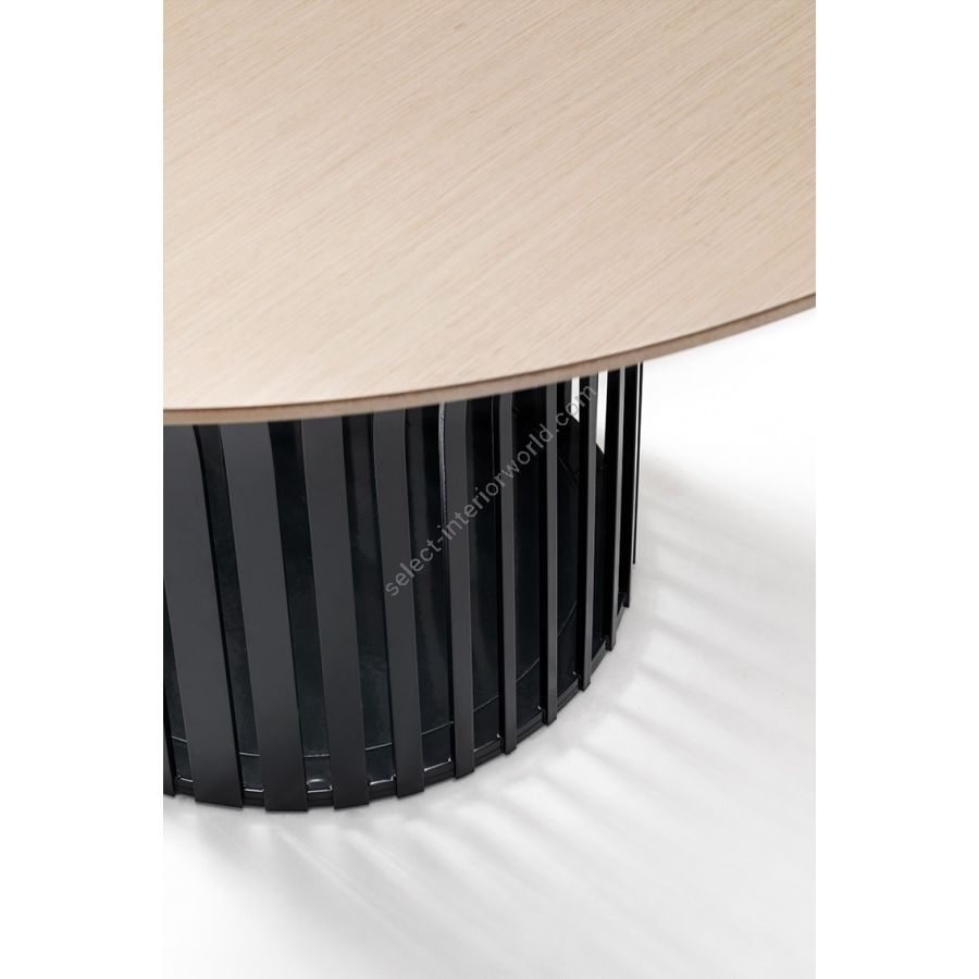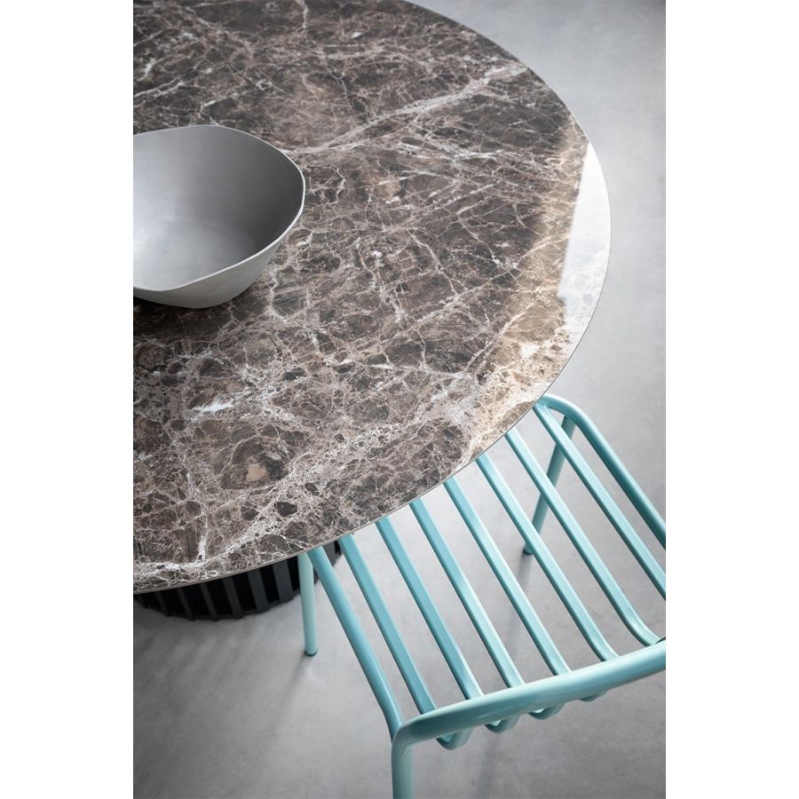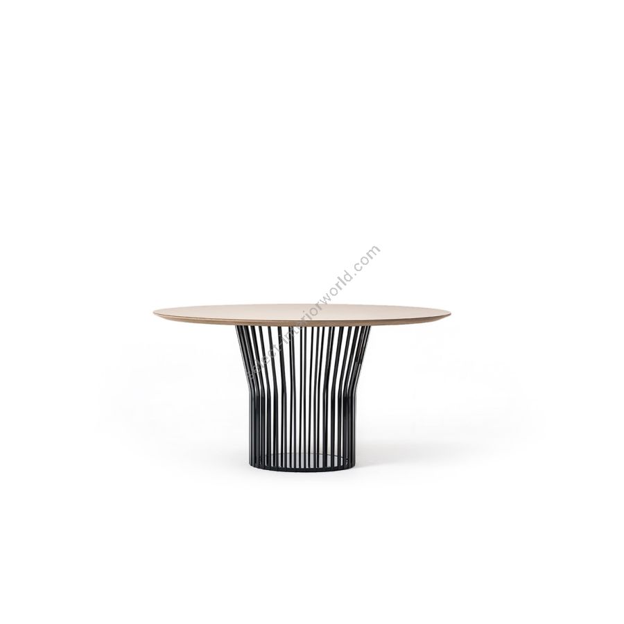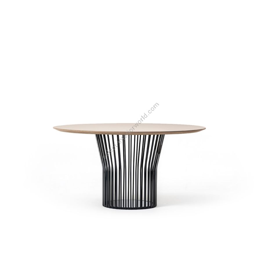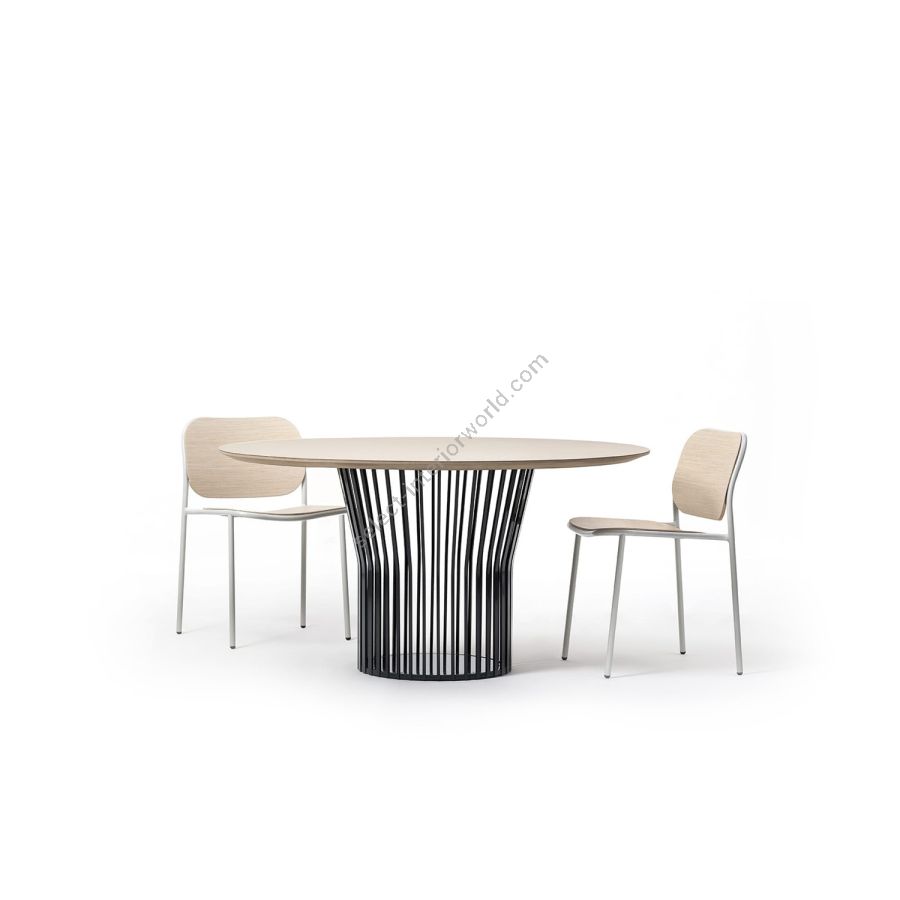 A collection of dining tables in two shapes, multiple sizes and multiple finishes to fit into all types of domestic or contract spaces and harmonize with the style of the environment. The metal base with an original and dynamic design is composed of spokes of different widths, which at the top bend outwards and open to support the round or 'barrel' top with rounded corners. Ray Table is available in ash, oak or heat-treated oak or in glass ceramic, marble or colored HPL.