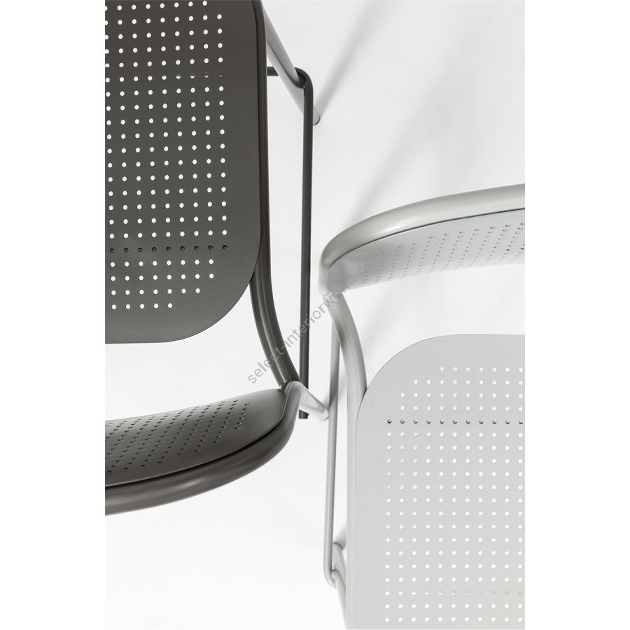 The collection includes the chair with or without armrests, the lounge version with or without armrest and the stool in two heights. In all versions, the tubular metal frame is complementedby curved, sheet metal backrests and seats with a decorative hole pattern that is a modern interpretation of the classic Viennese weave. Available in all standard and special colours, Metis Dot brings its unique style to indoor and outdoor spaces.