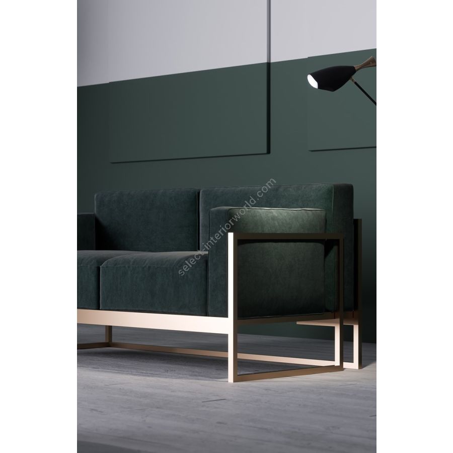 Kirk is a set of armchairs and sofas conceived as a game of building blocks, in which the container and the contents play an interlocking game based on minimal asymmetries, unexpected passages and subtle compositions. The Kirk Sofa fits perfectly in all spaces that set out to endow the living area with sophistication and originality. It redefines the concept of soft seating with an apparently simple solution that is brimming with intriguing surprises: the asymmetrical backrest and armrests are interchangeable, creating new interlocking combinations, without however sacrificing comfort and softness, which are provided by padded seats upholstered in tone-on-tone velvet. The composition options are expanded by the addition of a built-in shelf on either the right or left hand side of both the sofa and the armchair. The box-like frame of the armchair and sofa is made painted metal to match the cushions. The Kirk set is ideal for a quiet chat in pleasantly relaxing living areas, both at home and in hotel and resort lobbies. The Kirk collection includes an armchair and a two- and three-seater sofa, each with an optional side shelf.