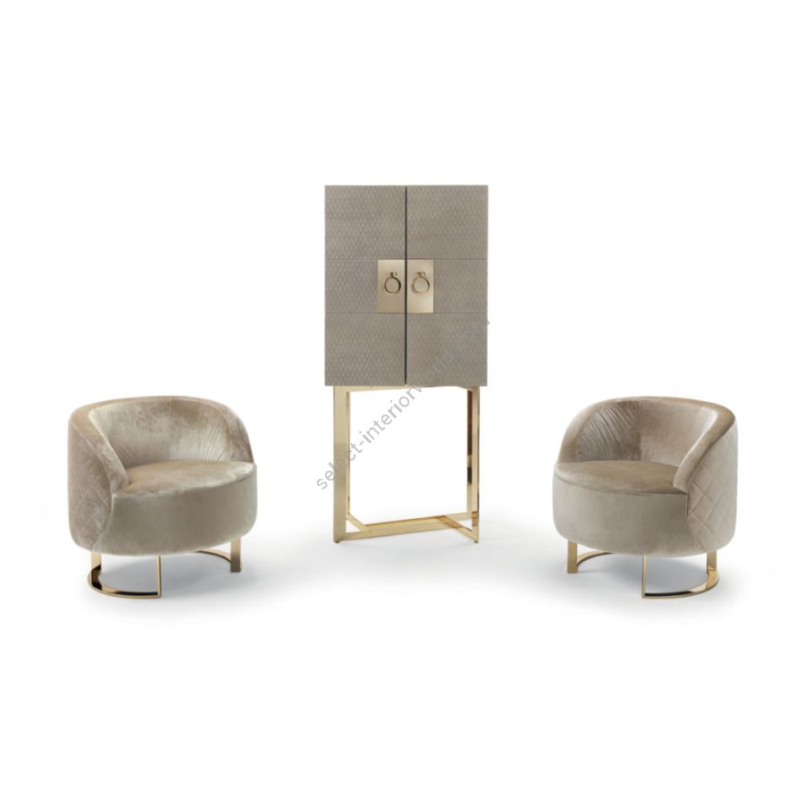 CALLA is a particular and enveloping modern armchair. The rounded shape of this armchair and its precious Champagne finishings give it a glamorous look suitable for a modern, contemporary living room or a bedroom. This armchair, with its refined character, fills every room with charm and elegance.