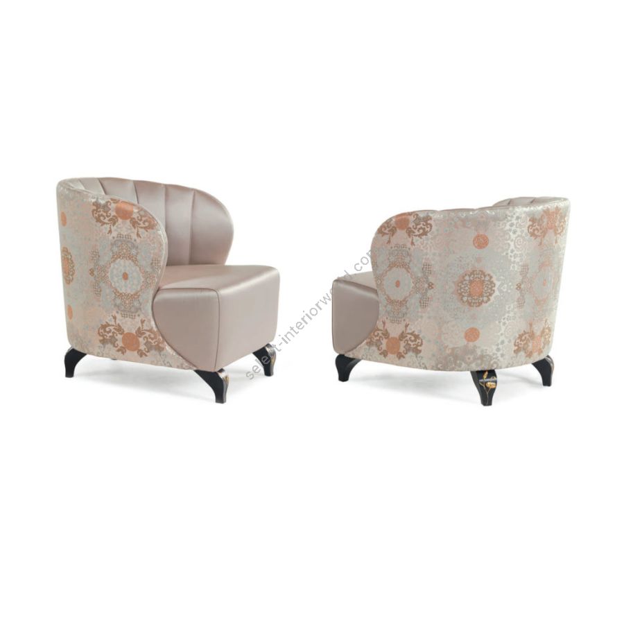 The elegant structure of this armchair is characterised by handcrafted decorations also on the feet.