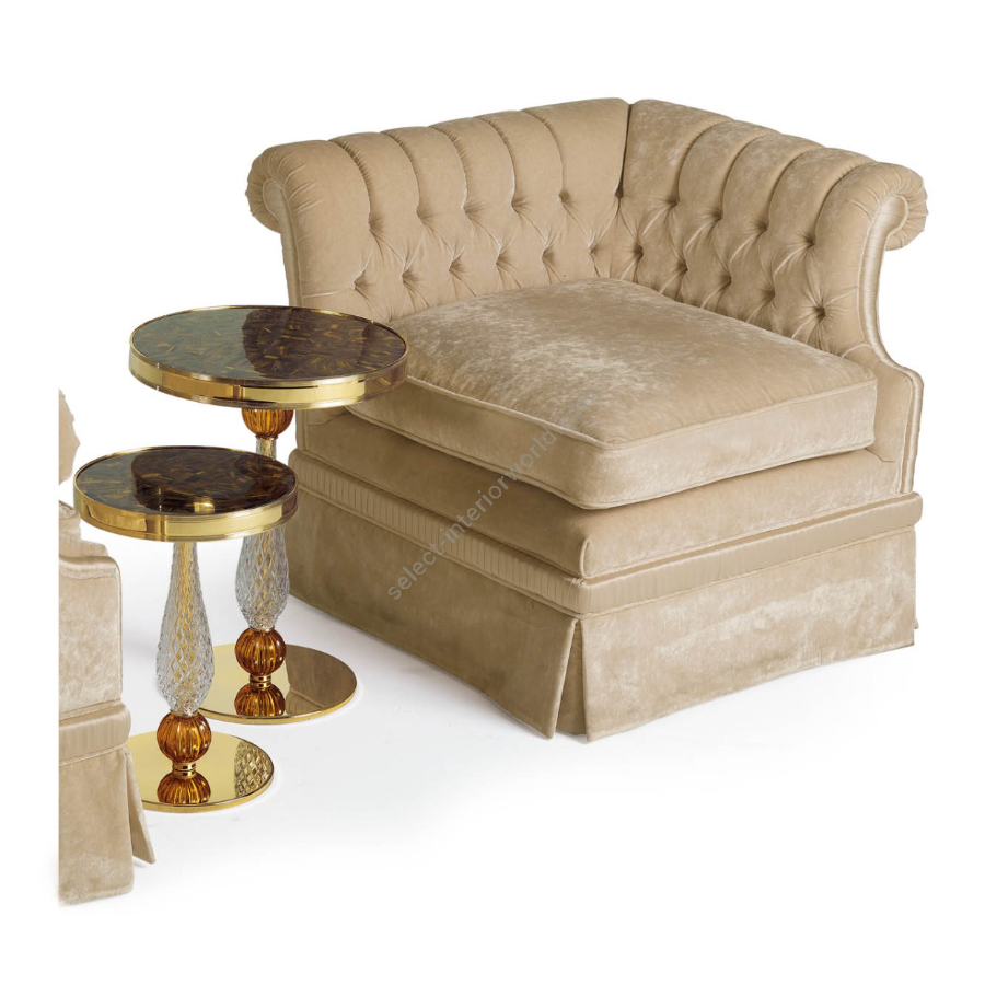 Elegant swivel corner armchair with capitonné style upholstery, easily combinable with other products with voluminous curled armrest and finely crafted backrest with characteristic diamond-shaped pattern with buttons.