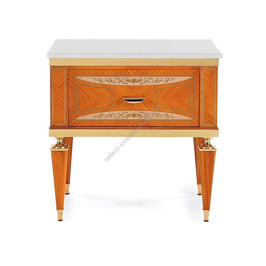 Elegant bedside table veneered in citronnier wood with marble top, enriched by brass details and ivory inlays. W038/NT is a sophisticated complement born from the long work of master craftsmen with decades of experience.