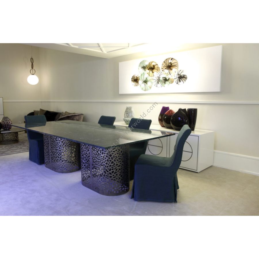 Contemporary style dining table supported by elegantly perforated bronzed metal cylinders; an iconic complement with an exclusive design finished with fine materials based on ancient artisan techniques.
