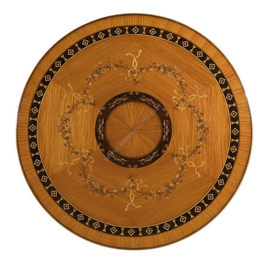 Circular dining table in citronnier wood and ebony. T/5140-180 is a true masterpiece of artistic craftsmanship made in Italy that comes from the long work of master craftsmen with decades of experience. T/5140-180 is a beautiful traditional piece of furniture dressed with combinations of absolute elegance.