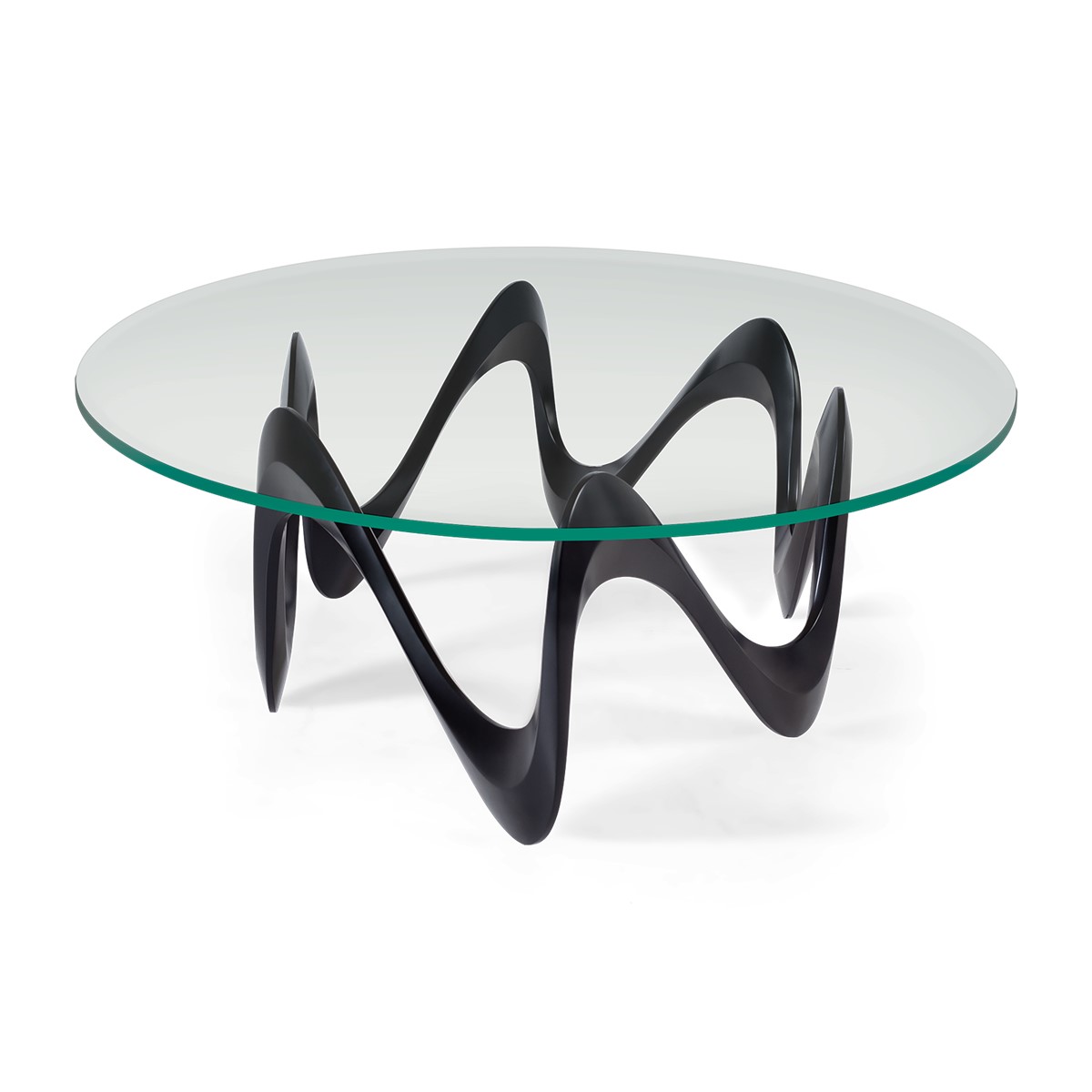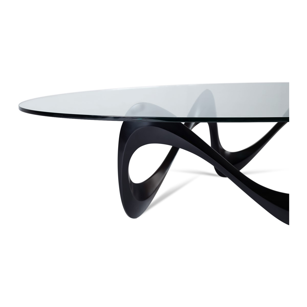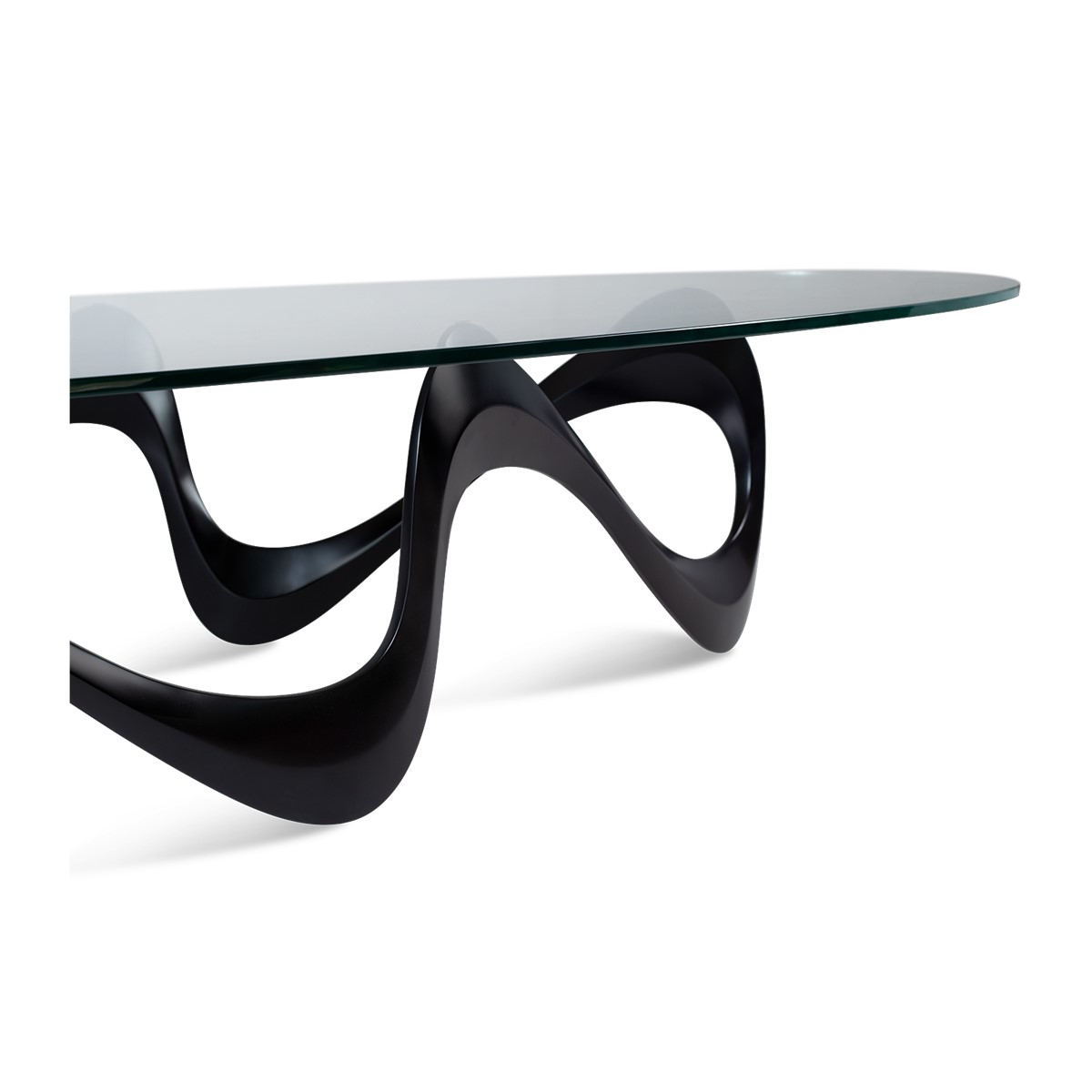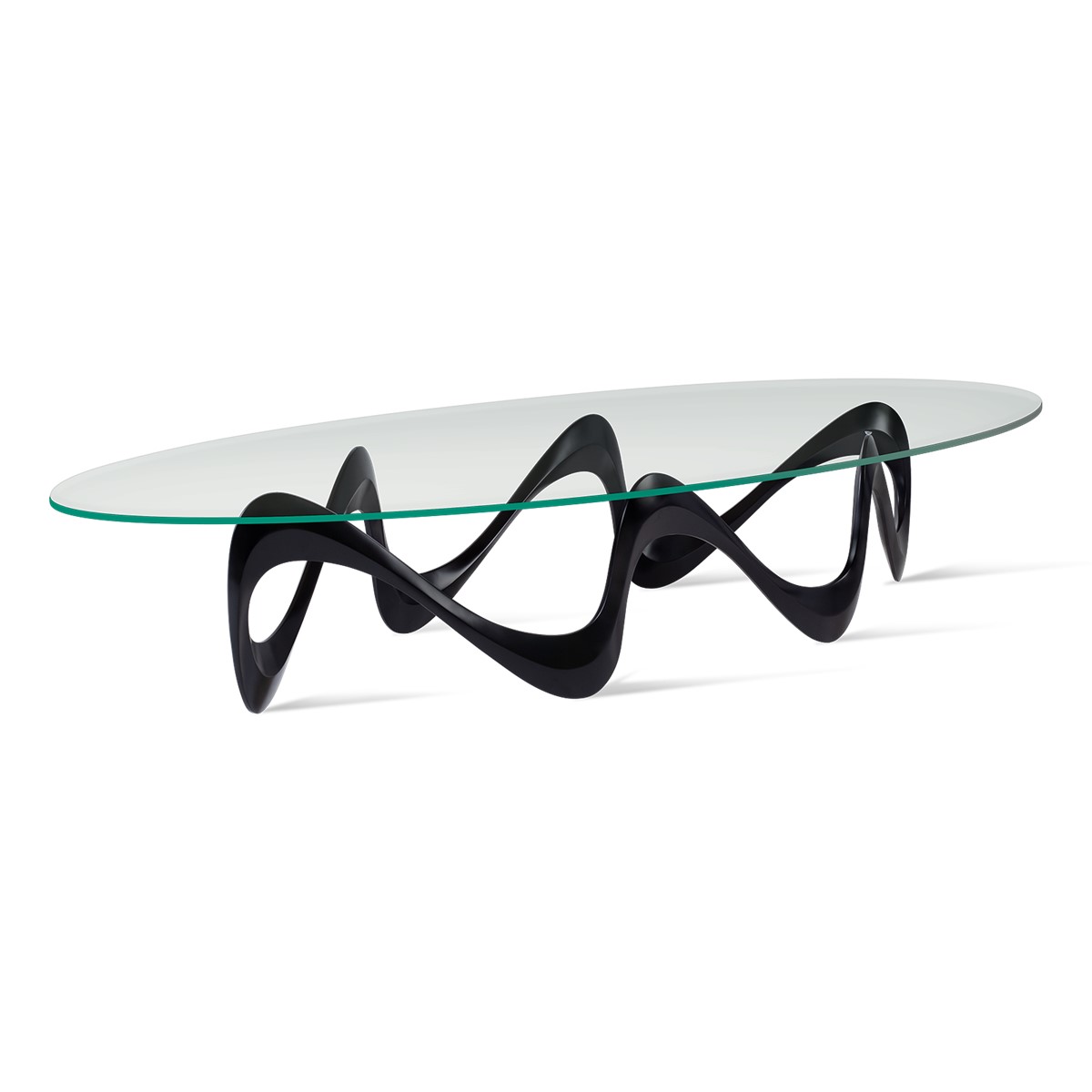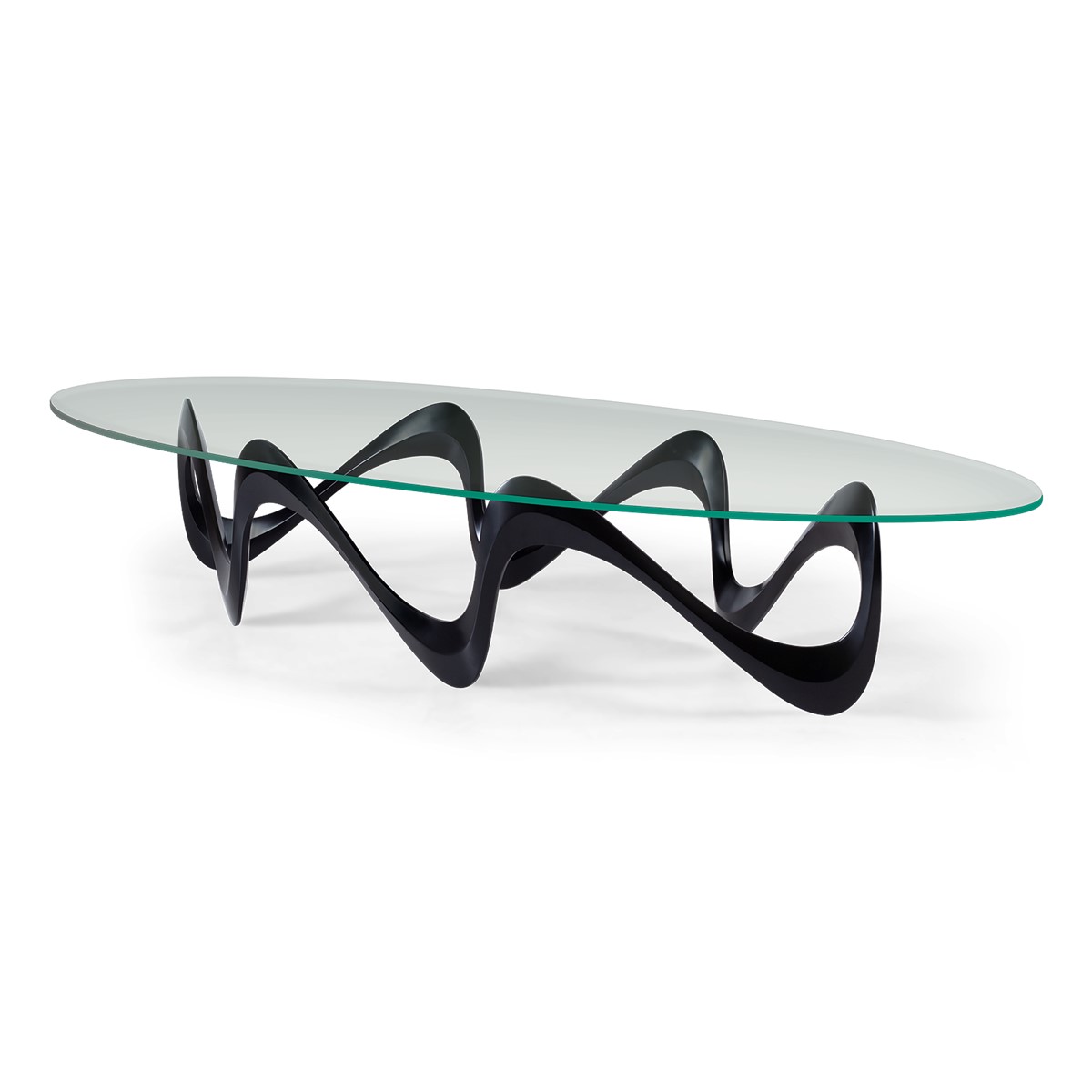 Vibrant and contemporary, with alluring curves and sensuous styling, the hand-cast aluminium base of this dramatic coffee table supports a clear oval tempered glass top.