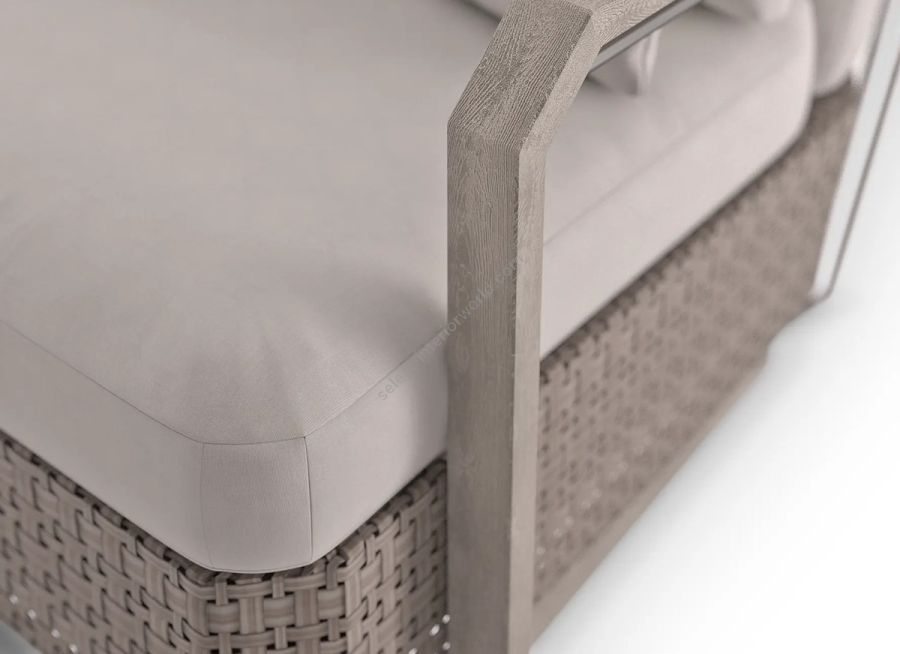 Inspired by prestigious holiday destinations, the Hampton Wood Outdoor Armchair flawlessly combines elegance and durability. Made from vintage wood, polished steel, weaving Seashell, and Nata fabric, it enhances any patio, terrace, or pool area with its modern aesthetic.