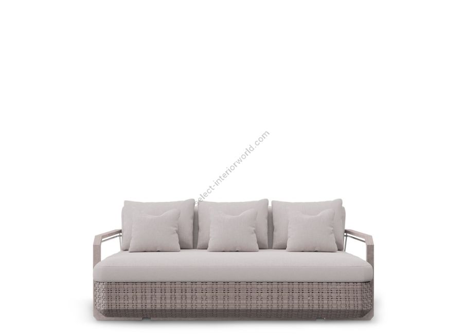 Hampton epitomizes class and style by presenting a layered character. This exclusive lounge sofa is covered in Nata fabric and has stainless steel armrests for a sleek yet robust aesthetic. Hampton is also completed in a vintage wood finish, and its base was achieved through a seashell weaving technique.