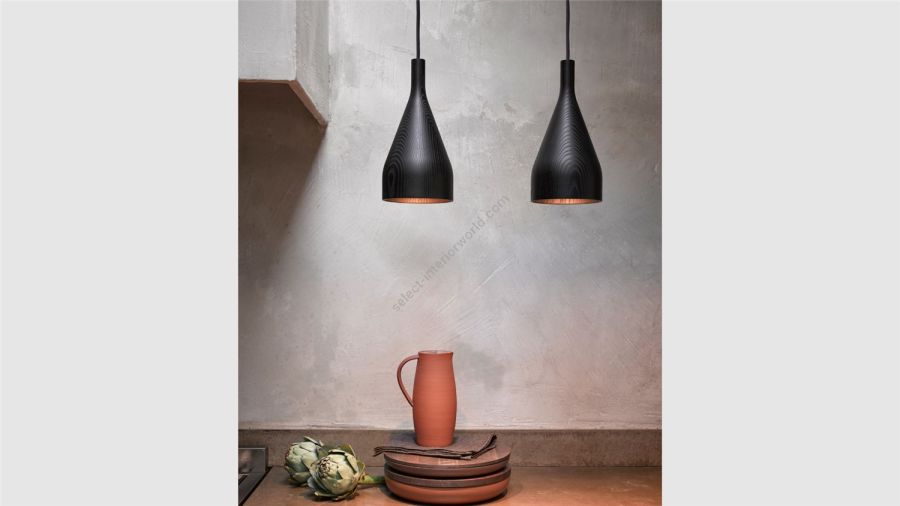The Timber shade is expertly turned from a single piece of wood. For this collection, three high-quality varieties of wood are used: ash, oak and walnut. A subtle black paint is applied to the ash wood version, leaving the elegant wood lines visible. The cables come with a matching casing of black linen. The pendant light is assembled in the workshop of a social enterprise in The Hague by individuals who fall outside the labour market.