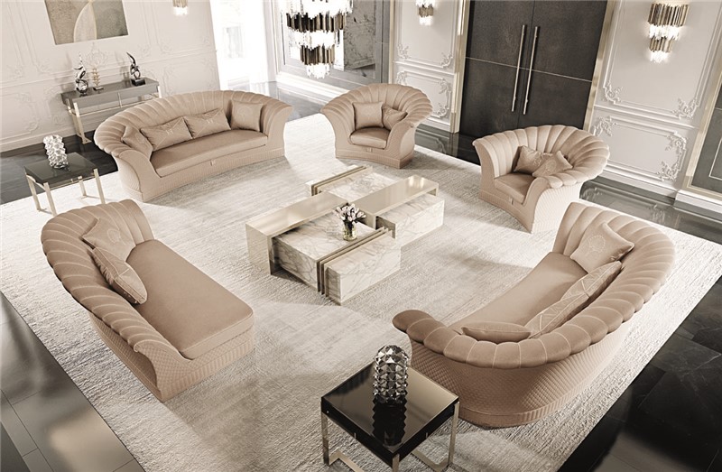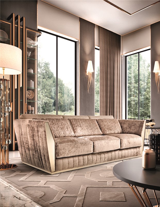 Sofa with partially removable covering. Structure in fir wood and poplar multi-layer. Seat cushion with springs and SOFT-SYSTEM technology. The padding made from non-deformable polyurethane foam in different densities. The steel base and front panels are standard. Instead, for the particular finishes, please consider the increase according a price list. This model is available with bed mechanism, with mattress of 11 cm in non-deformable high-density polyurethane, covered with a removable and washable lining with aloe treatment. The quilted parts should be considered as an accessory and increased according a price list.