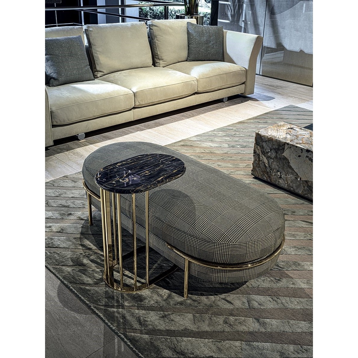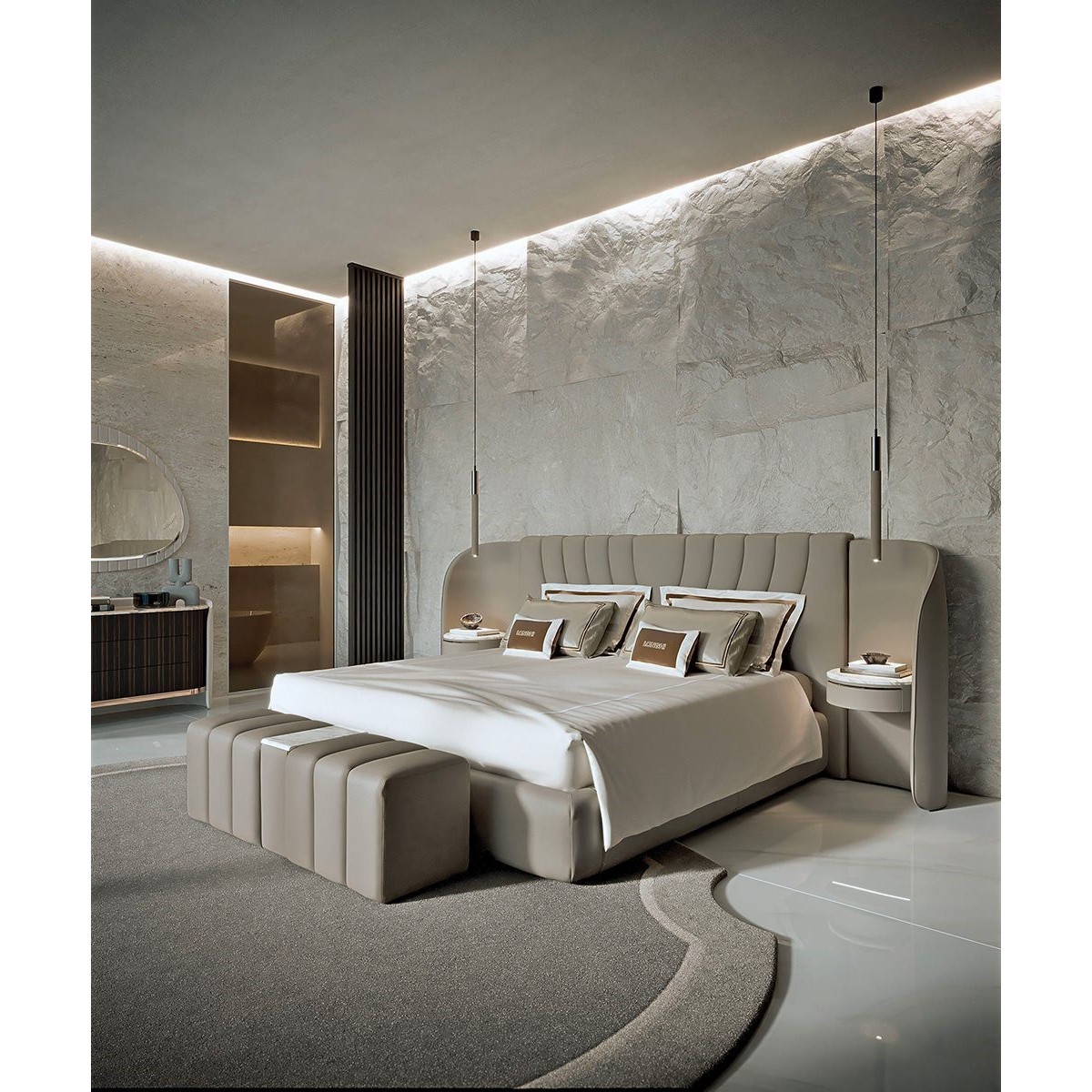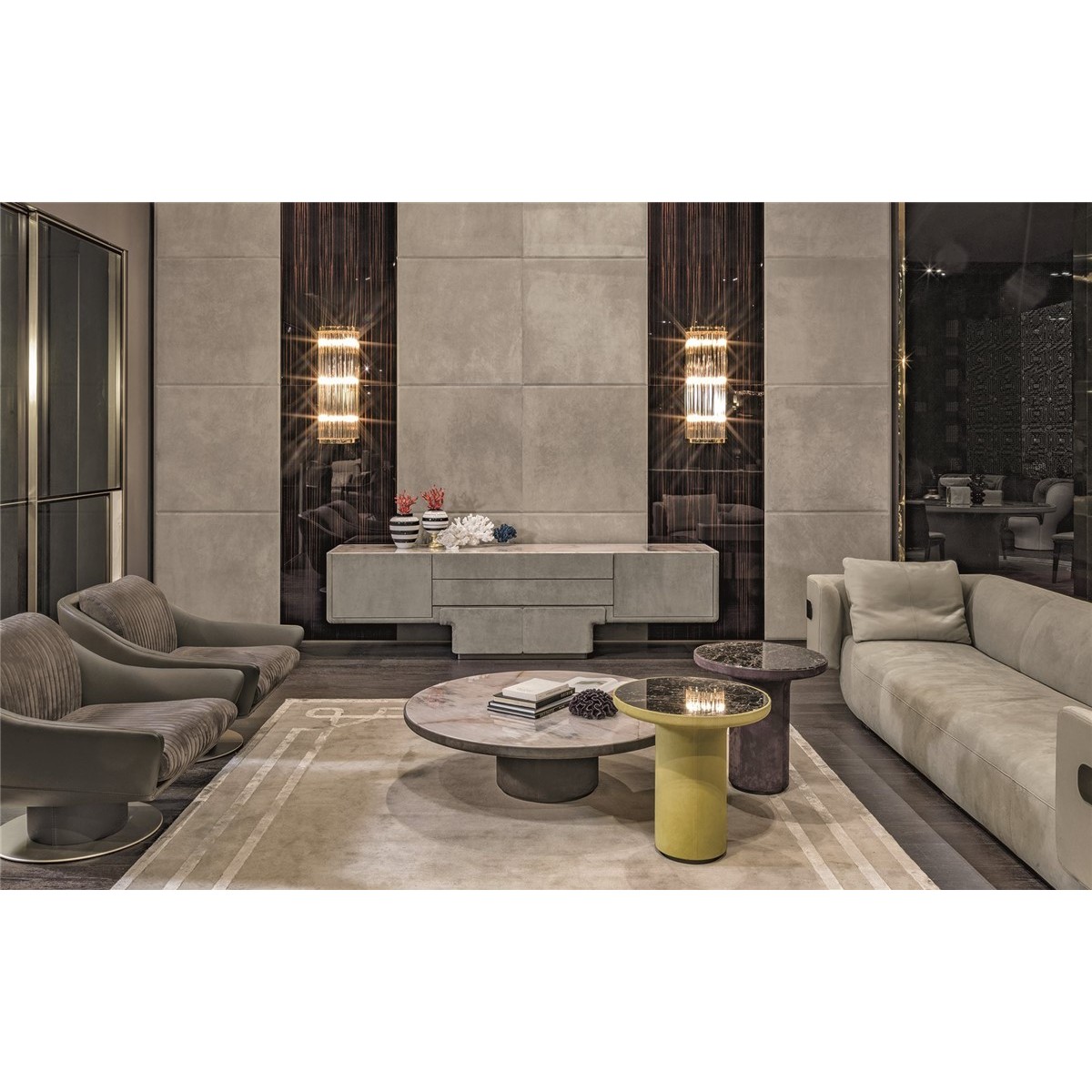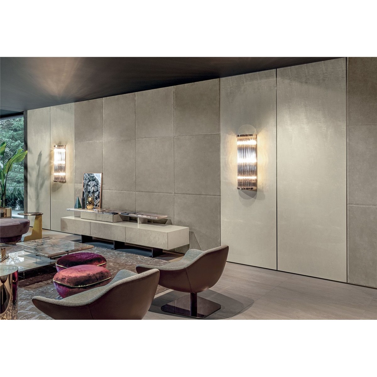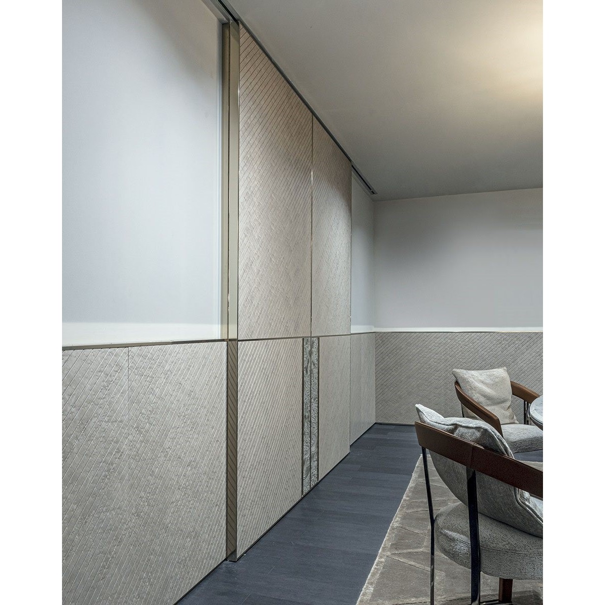 The Boiserie Endless system has many modular features that make it possible to furnish rooms with elegant finishes that we find in the Ianus series. Thanks to the relief patterns and textures of the wood and leather, “touching” them conveys a pleasant and rewarding feeling.