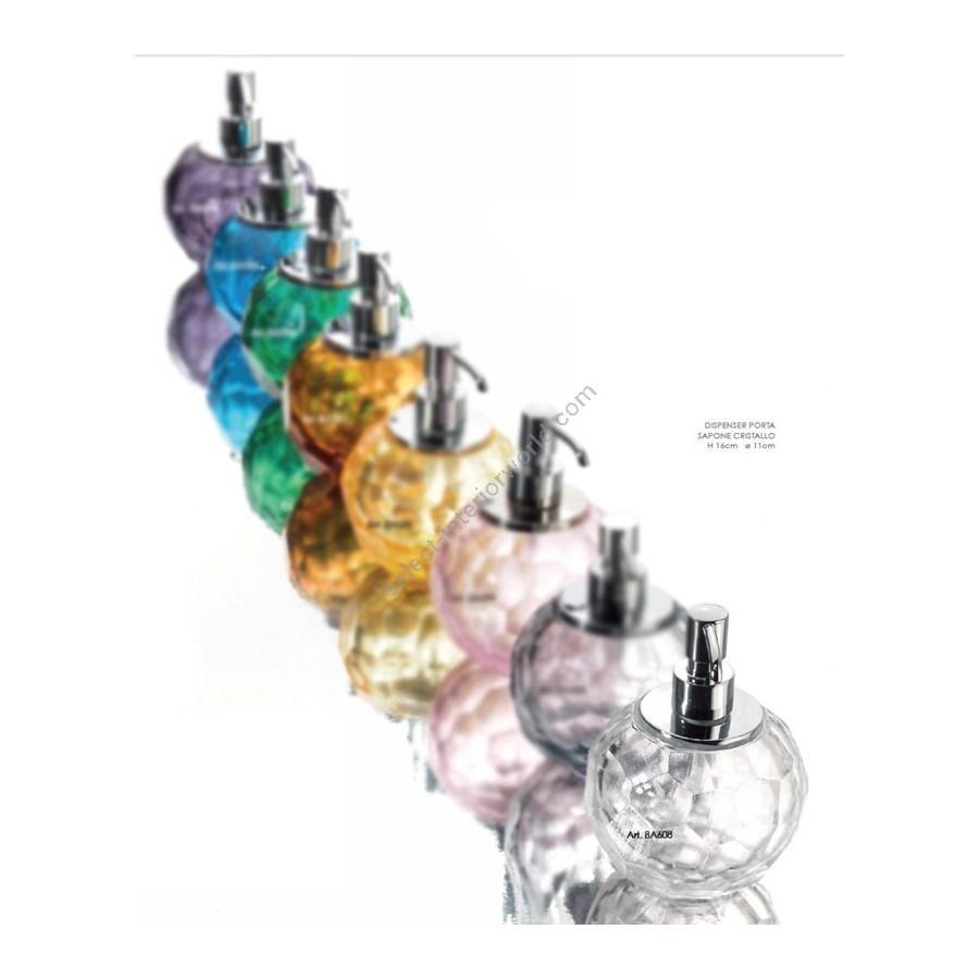 Italian scratched crystal Soap dispenser, transparent colour. Finish: KR. Functional elements that create an extremely elegant, welcoming and high-value bathroom.