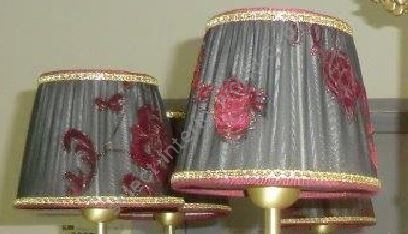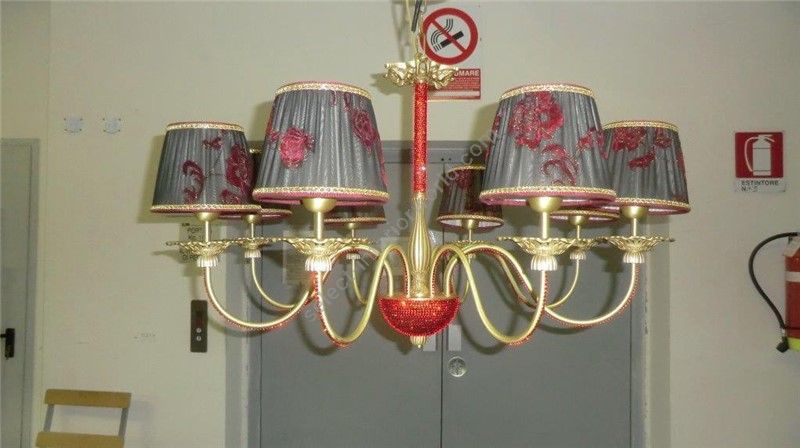 Chandelier in brass with application of strass and fabric lampshades. Lighting item that diffuses the light with great effect in the surrounding environement creating a warm and welcoming atmosphere.