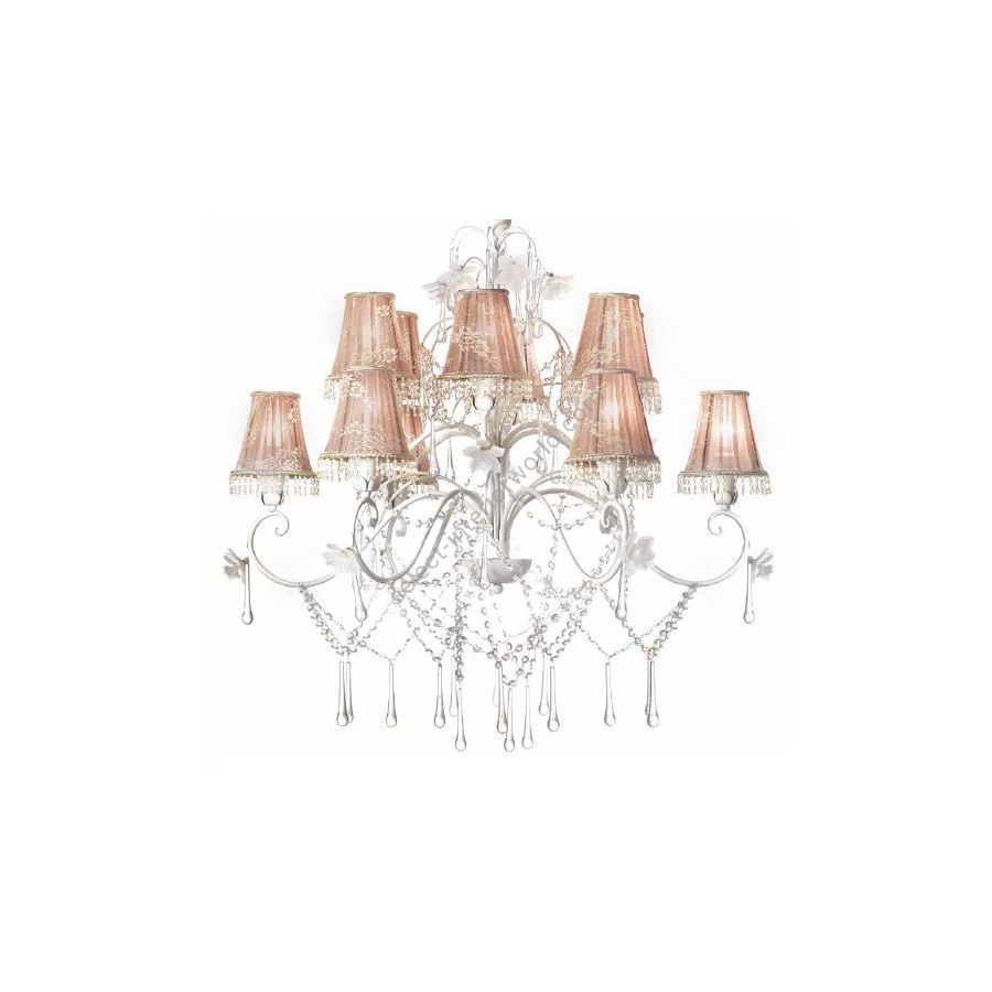 PEARL Collection: 12 lights chandelier in white metal is decorated with crystal pendants and Murano glass roses and drops. Lampshades in lace and pongè fabric add a romantic touch to this elegant chandelier. Lighting item that diffuses the light with great effect in the surrounding environement creating a warm and welcoming atmosphere.