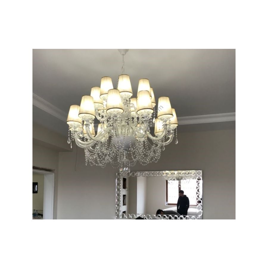 18 lights chandelier in clear Murano glass with crystal elements and pendants (attention new crystal cup!). Lighting item that diffuses the light with great effect in the surrounding environement creating a warm and welcoming atmosphere.