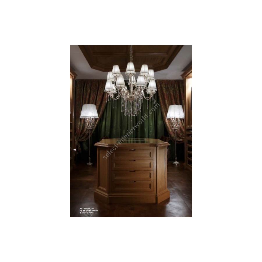 16 lights gorgeous chandelier in cast brass and rich crystal pendants. Beautiful hand-made lampshades in silk complement this elegant masterpiece. Lighting item that diffuses the light with great effect in the surrounding environement creating a warm and welcoming atmosphere.