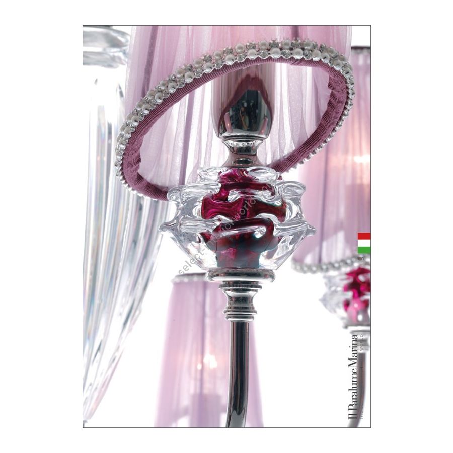 Chandelier in cast brass with lillac lampshades and hand-made crystal roses. Lighting item that diffuses the light with great effect in the surrounding environement creating a warm and welcoming atmosphere.