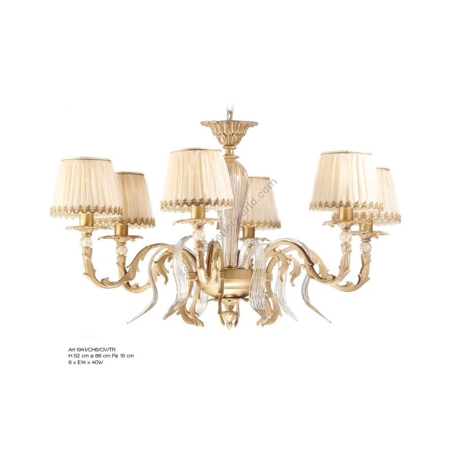 6 lights cast brass Chandelier with Murano glass leaves. Lighting item that diffuses the light with great effect in the surrounding environement creating a warm and welcoming atmosphere.