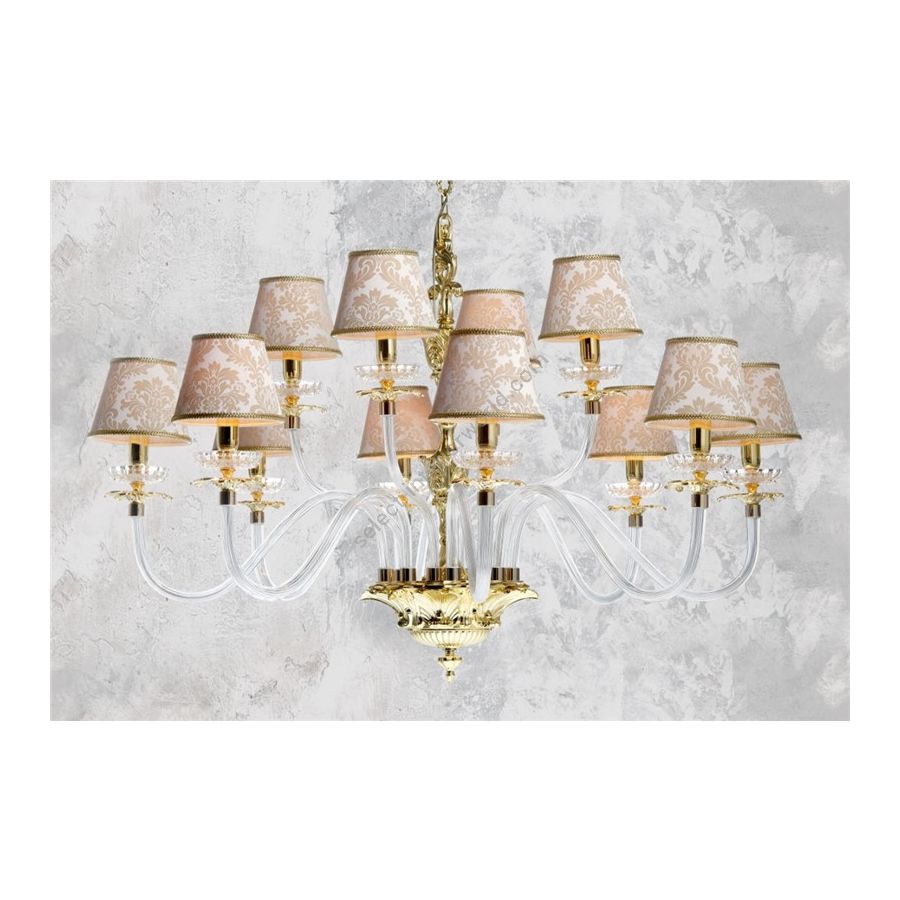Chandelier in casting brass and trasparent Murano arms. Lighting item that diffuses the light with great effect in the surrounding environement creating a warm and welcoming atmosphere.