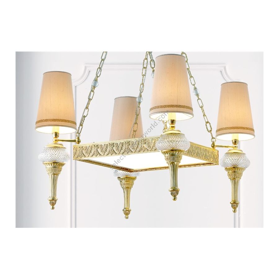 Chandelier in Casting Brass and Florence crystals elements. Lighting item that diffuses the light with great effect in the surrounding environement creating a warm and welcoming atmosphere.