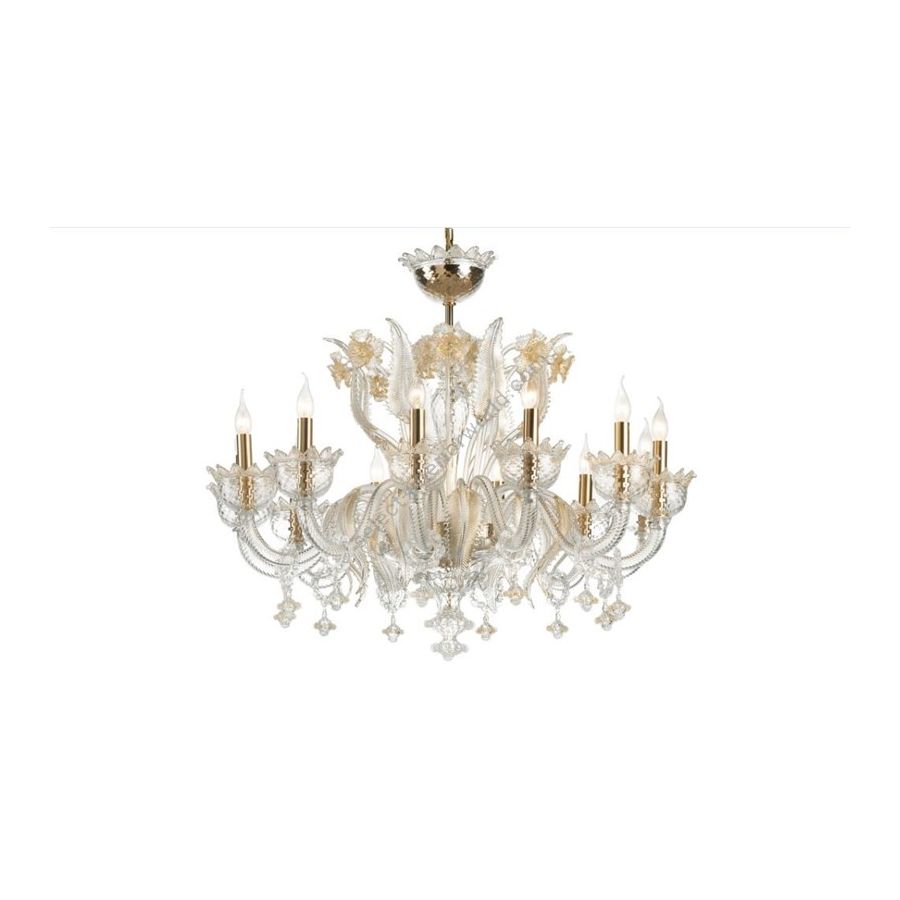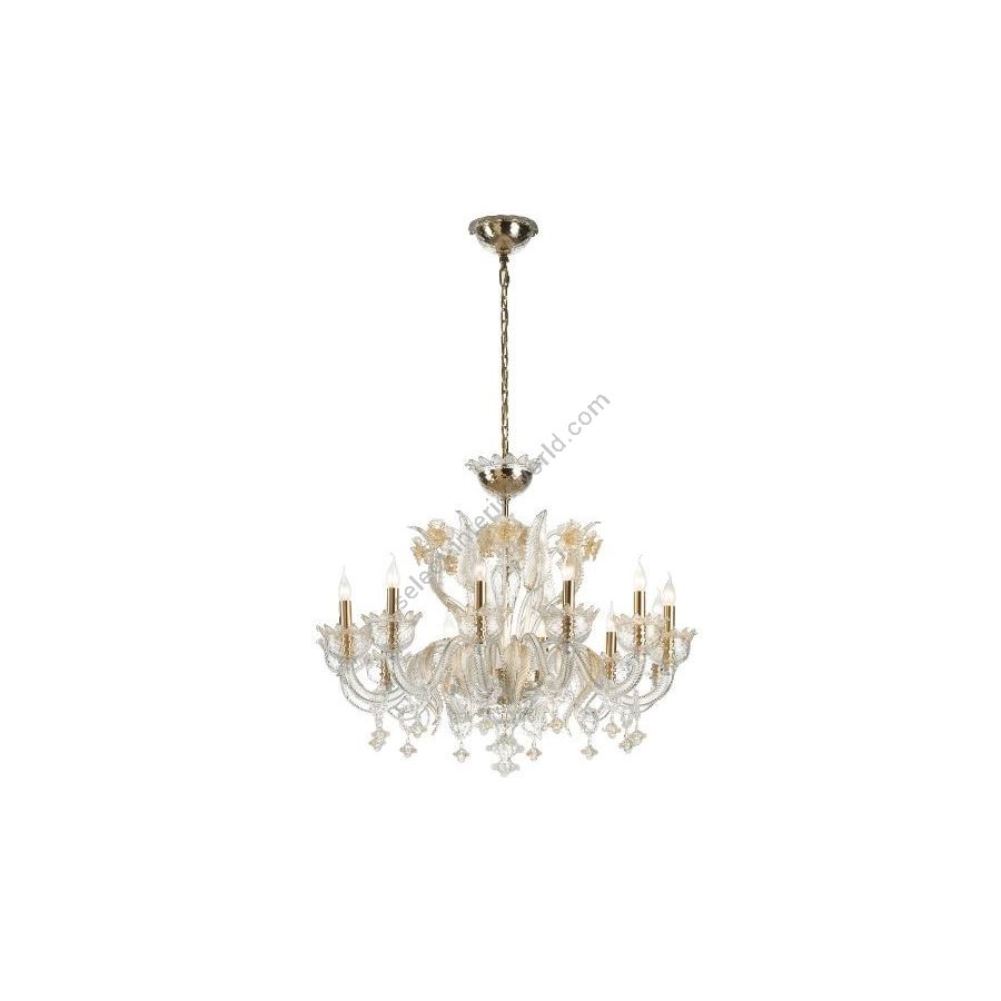 Murano Glass chandelier transparent with decoration in transparent + gold powder. Lighting item that diffuses the light with great effect in the surrounding environement creating a warm and welcoming atmosphere.