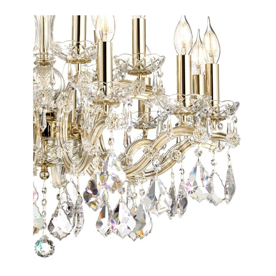 Mariateresa chandelier with soft gold metal frame covered by transparent glass arms and transparent Asfour® Crystal pendants. Lighting item that diffuses the light with great effect in the surrounding environement creating a warm and welcoming atmosphere.