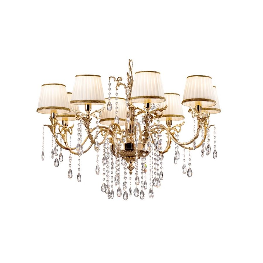 Chandelier in cast brass with lampshades and crystal pendants. Lighting item that diffuses the light with great effect in the surrounding environement creating a warm and welcoming atmosphere.