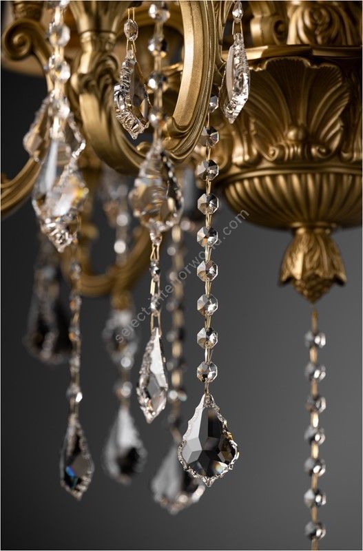 Cast brass chandelier with Asfour® crystal pendants. Baroque style chandelier rich in crystal and pendants. Complete with 1 meter chain and matching ceiling rose.