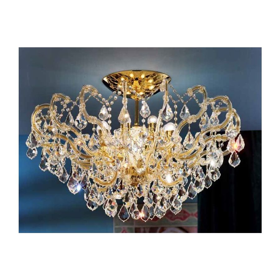 Mariateresa chandelier with Gold plated metal frame covered by transparent glass arms and transparent Crystal pendants. Lighting item that diffuses the light with great effect in the surrounding environement creating a warm and welcoming atmosphere.