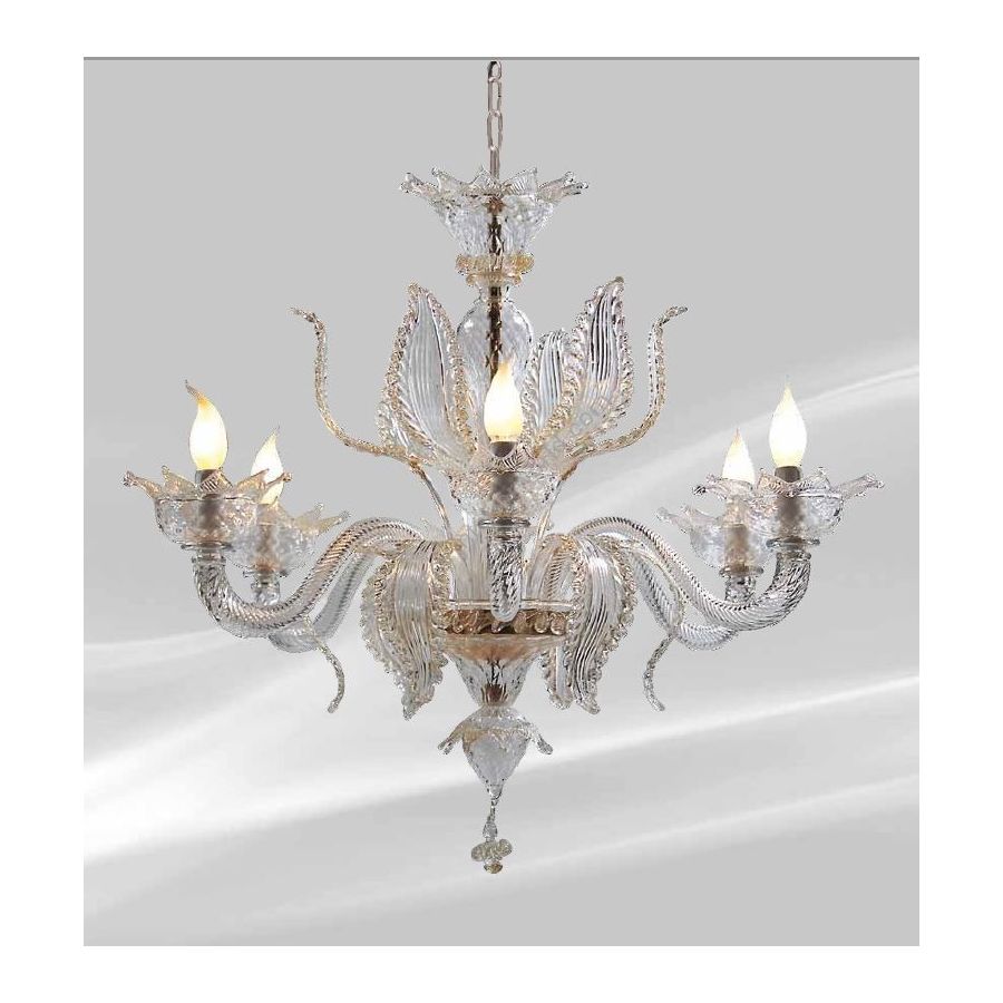 6 lights transparent and golden chandelier. Lighting fixture that diffuses the light into the surrounding environment with great effect, creating a warm and welcoming atmosphere.