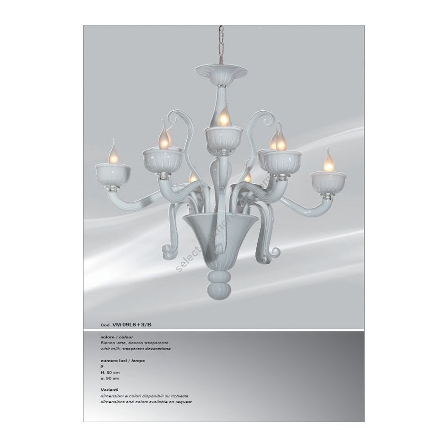 9 lights milky white chandelier with transparent decoration. Lighting fixture that diffuses the light into the surrounding environment with great effect, creating a warm and welcoming atmosphere.