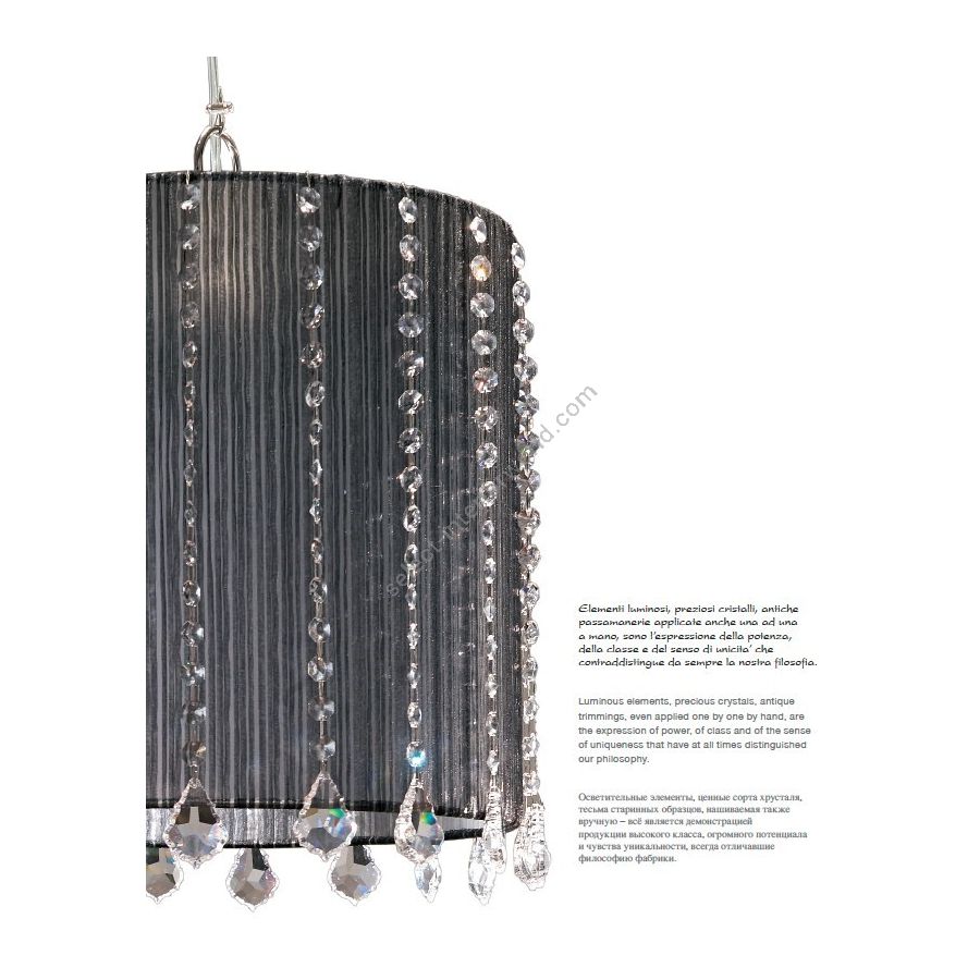 Cilindrical black lampshade suspension with cristals. Lighting item that diffuses the light with great effect in the surrounding environement creating a warm and welcoming atmosphere.