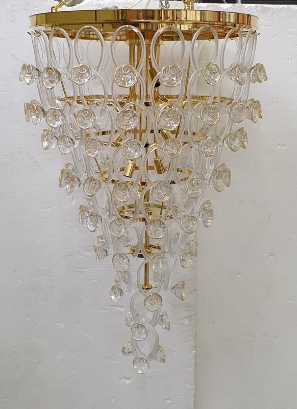 Chandelier made with transparent ang gold roses made of Murano glass