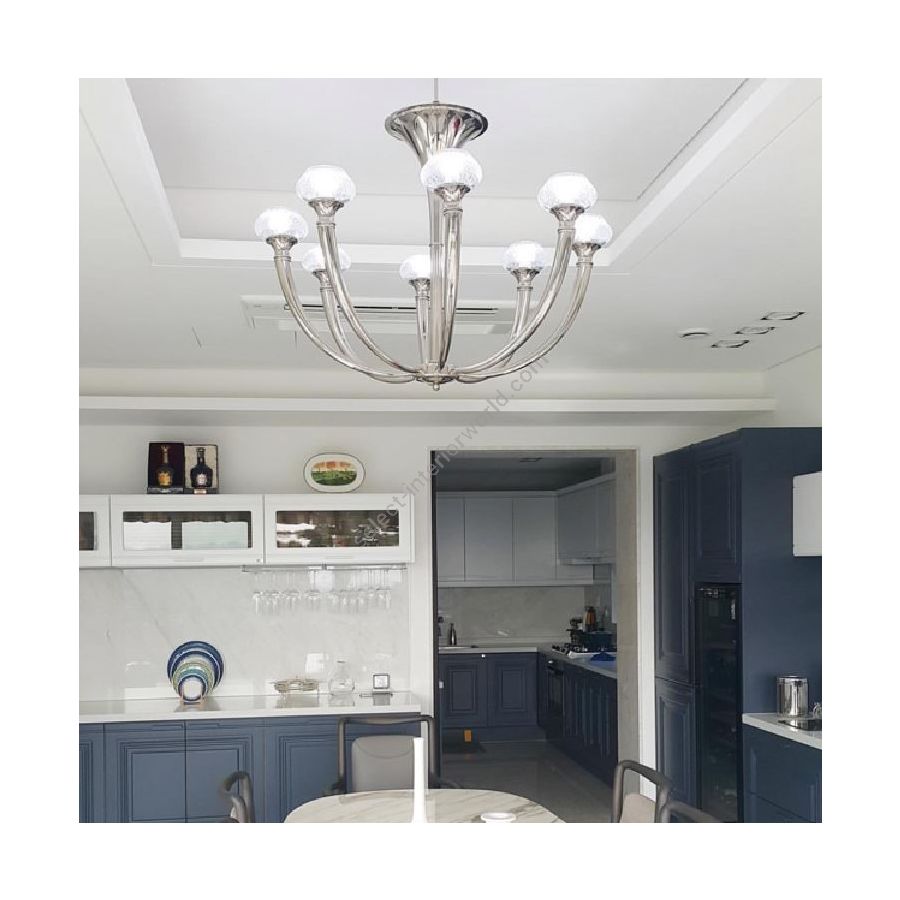 8 lights Chandelier in brass with Crystal lampshades. Lighting item that diffuses the light with great effect in the surrounding environement creating a warm and welcoming atmosphere.