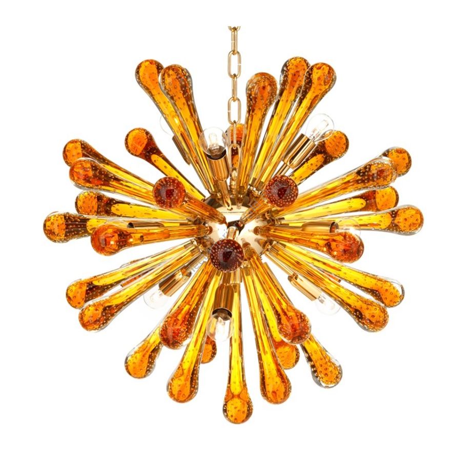 Chandelier with amber Murano Glass drops. Lighting item that diffuses the light with great effect in the surrounding environement creating a warm and welcoming atmosphere.