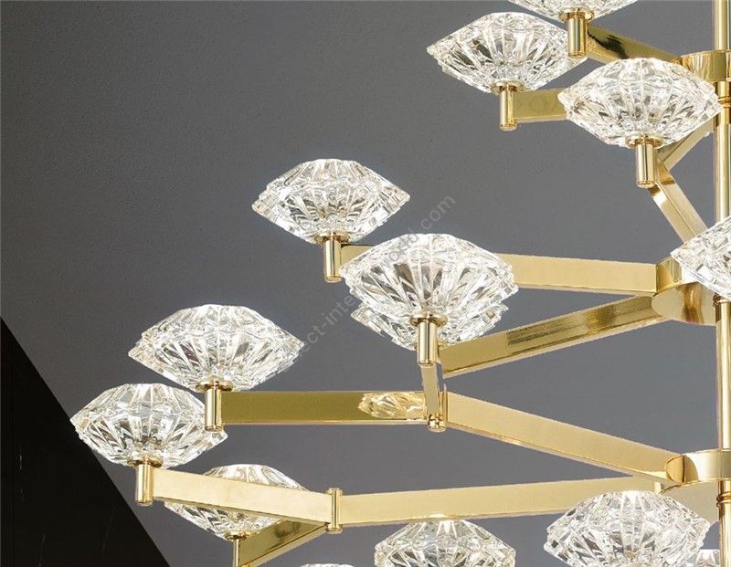 Chandelier in contemporary art deco' style made in brass metal in soft gold finishing. With italian Crystal cups hand-cut on 24%pb. (metal cup and steel cable 50 cm included). Lighting item that diffuses the light with great effect in the surrounding environement creating a warm and welcoming atmosphere.